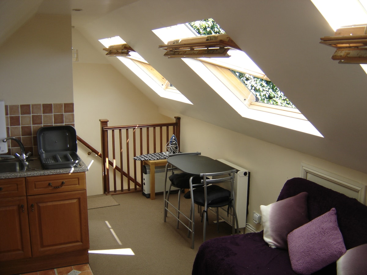Selvbetjent studio, suite, over dobbel garasje, bestående av seng/stue, tekjøkken og separat toalett/dusjrom. Har tre store Velux-enker som sikrer god lys- og luftsirkulasjon. Inneholder mikrobølgeovn, kjøleskap, vannkoker, kjøkkenutstyr osv. Ideelt egnet for opptil to voksne, pluss ett barn under 16 år. Ligger i landsbyen Datchworth, i nærheten av Knebworth og Stevenage. 2 1/2 miles til hovedlinjestasjonen, til Kings Cross eller nord.