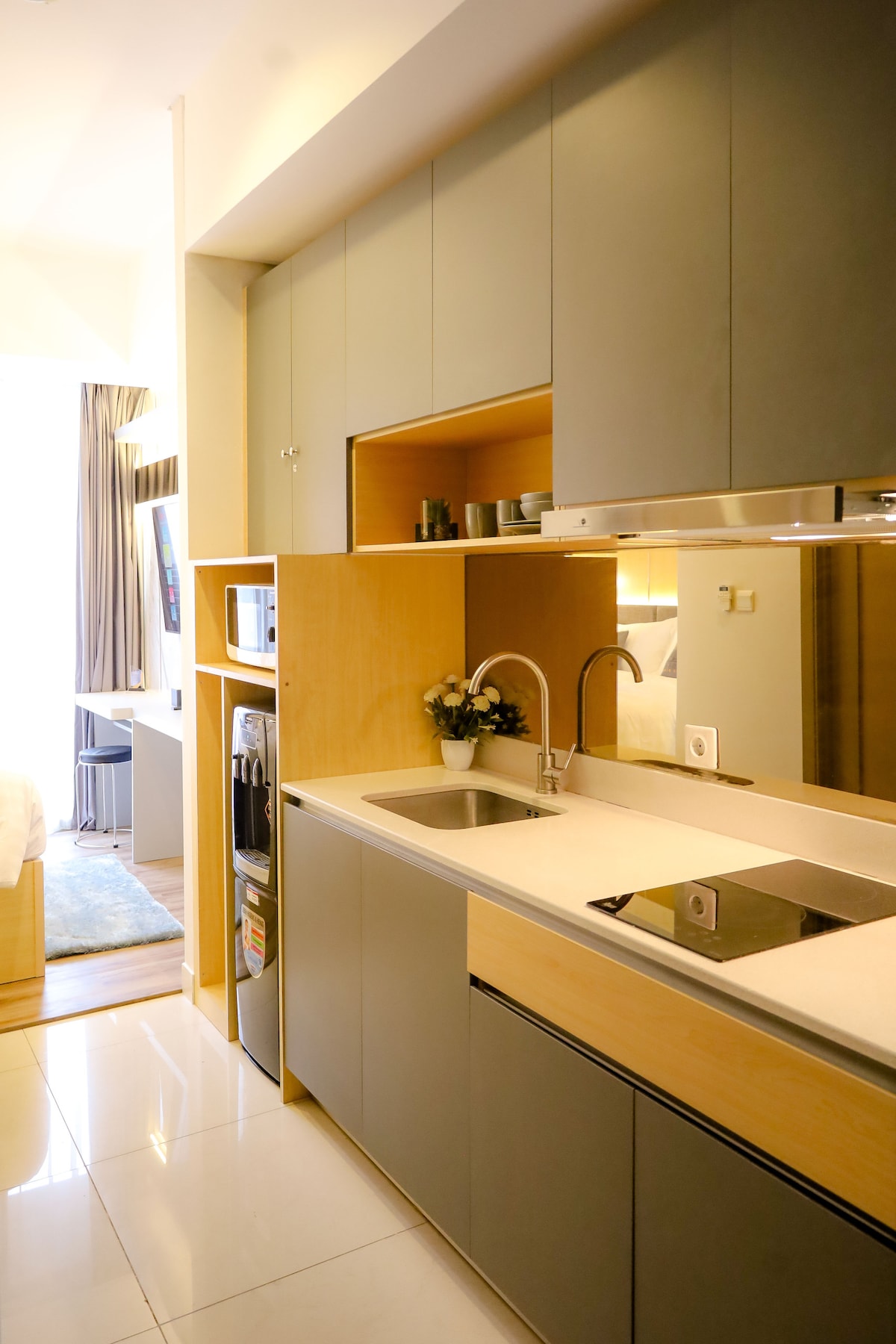 Helt ny studioleilighet i moderne stil med 50"Samsung Smart TV Crystal 4K UHD. Ligger i Tower Fragrant i nærheten av Hublife&Taman Anggrek Mall. - Netflix uten ekstra kostnad - trådløst nettverk uten ekstra kostnad. - utenstrømmende mineralvann - Spispenser - elektrisk komfyr -Minikjøleskap - Mikael - hårføner - kroppsvask - arbeidsbord Landemerker i nærheten: 5 minutter til Central Park Mall, Neo Soho Mall og 10 minutter til Ciputra Mall. 20 minutter til flyplassen.