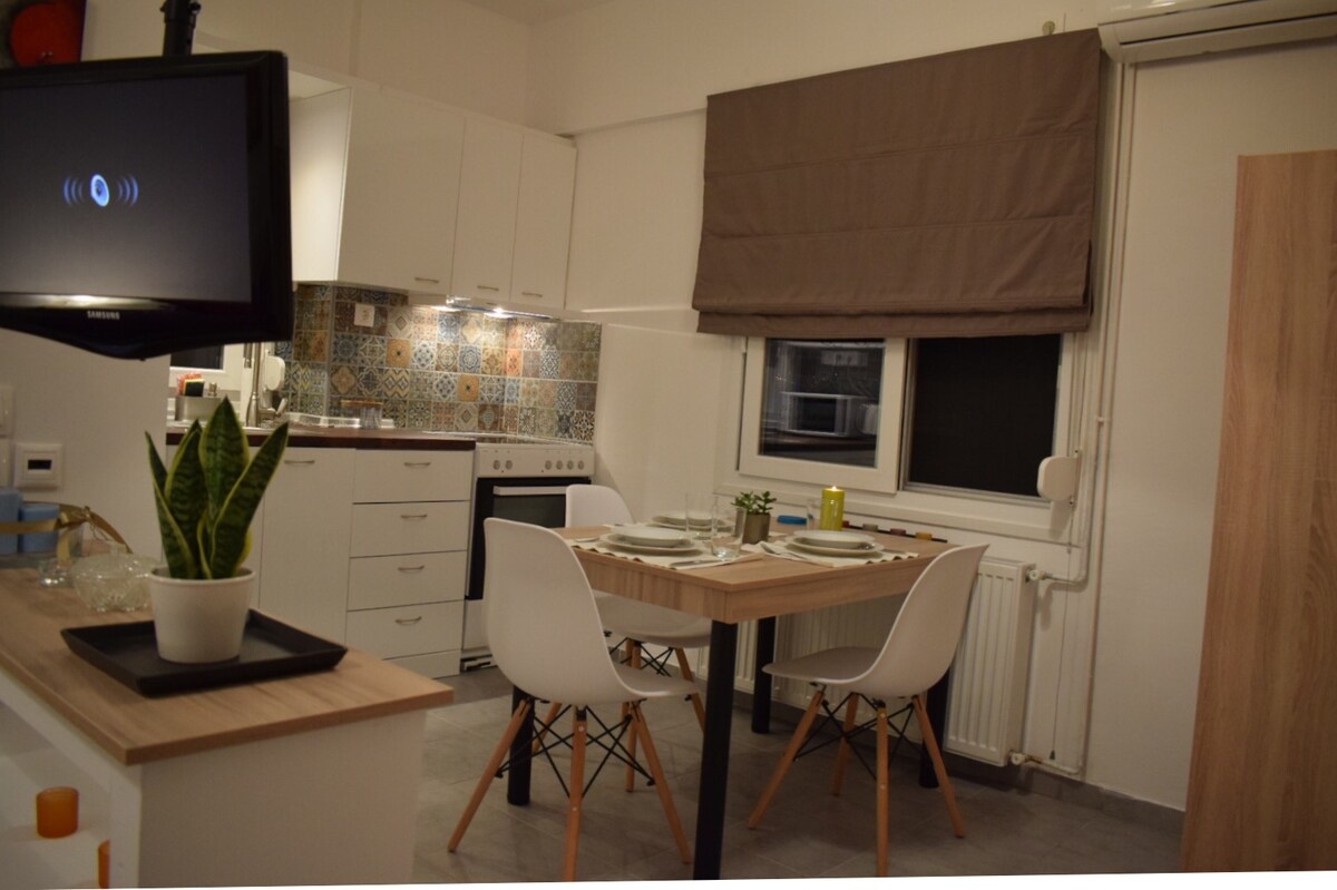 Et vakkert lite studio med alle fasilitetene, inn i sentrum, men samtidig i et rolig hjørne. I en radius på mindre enn 500 meter er det: Togstasjon, Intercity-busser, byens fremtidige T-bane og domstolene. Ved siden av det tradisjonelle herskapshuset "Villa Petrides", det "kinesiske markedet" og de pittoreske smugene i "Ladadika". Noen få meter lenger ned begynner den berømte havnefronten i Thessaloniki.På den romslige terrassen kan du nyte drinken din med en åpen utsikt.