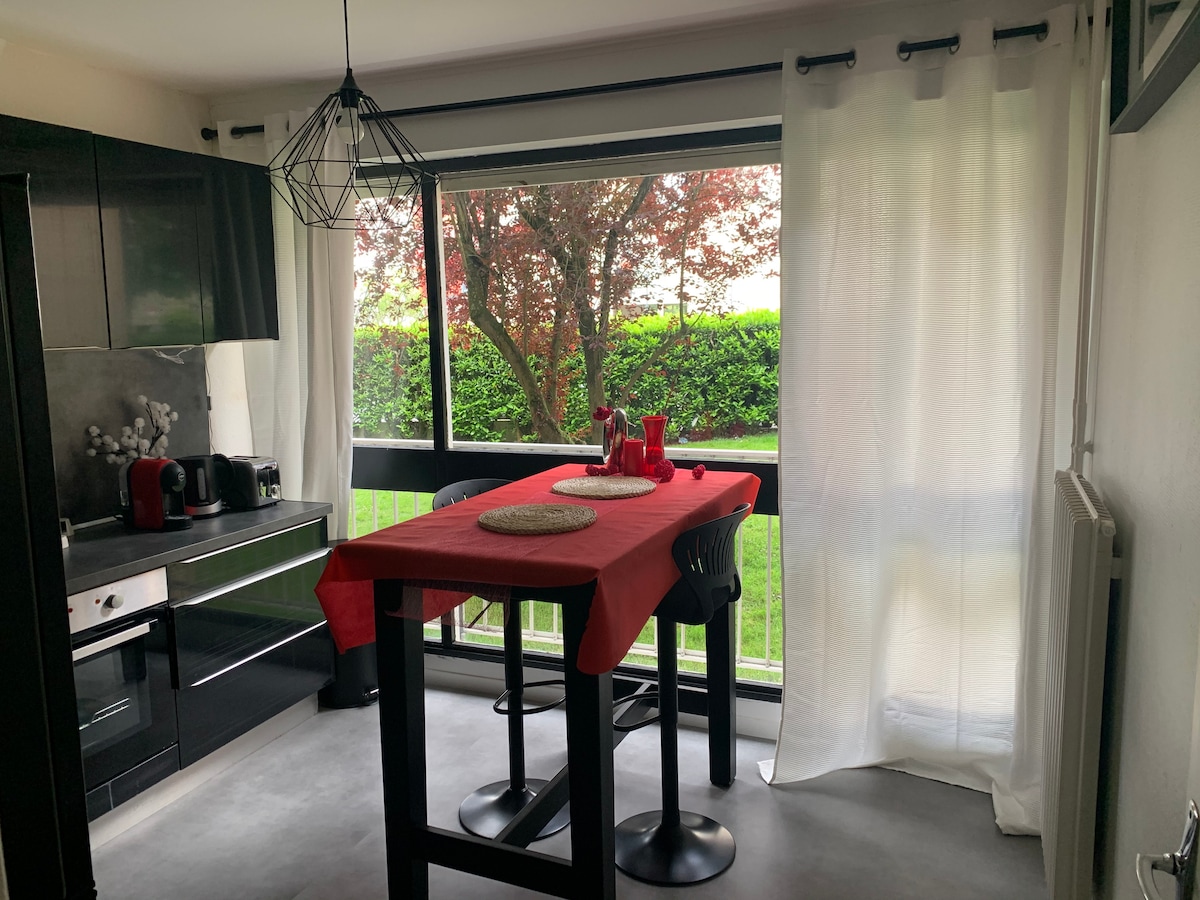 Full leilighet i første etasje uten heis og ikke oversett i en rolig og skogkledd leilighet. Veldig nærhet til hovedbusslinjer og T-bane b Enkel tilgang til togstasjonen, sentrum samt utstillingsparken og flyplassen i Saint Jacques Fullt utstyrt kjøkken.. stue med TV.. moderne dusjrom og to vakre soverom med dobbeltsenger.. mulighet til å legge til en madrass på gulvet og en BZ for å legge til noen senger.. dyner,puter og håndklær tilgjengelig.