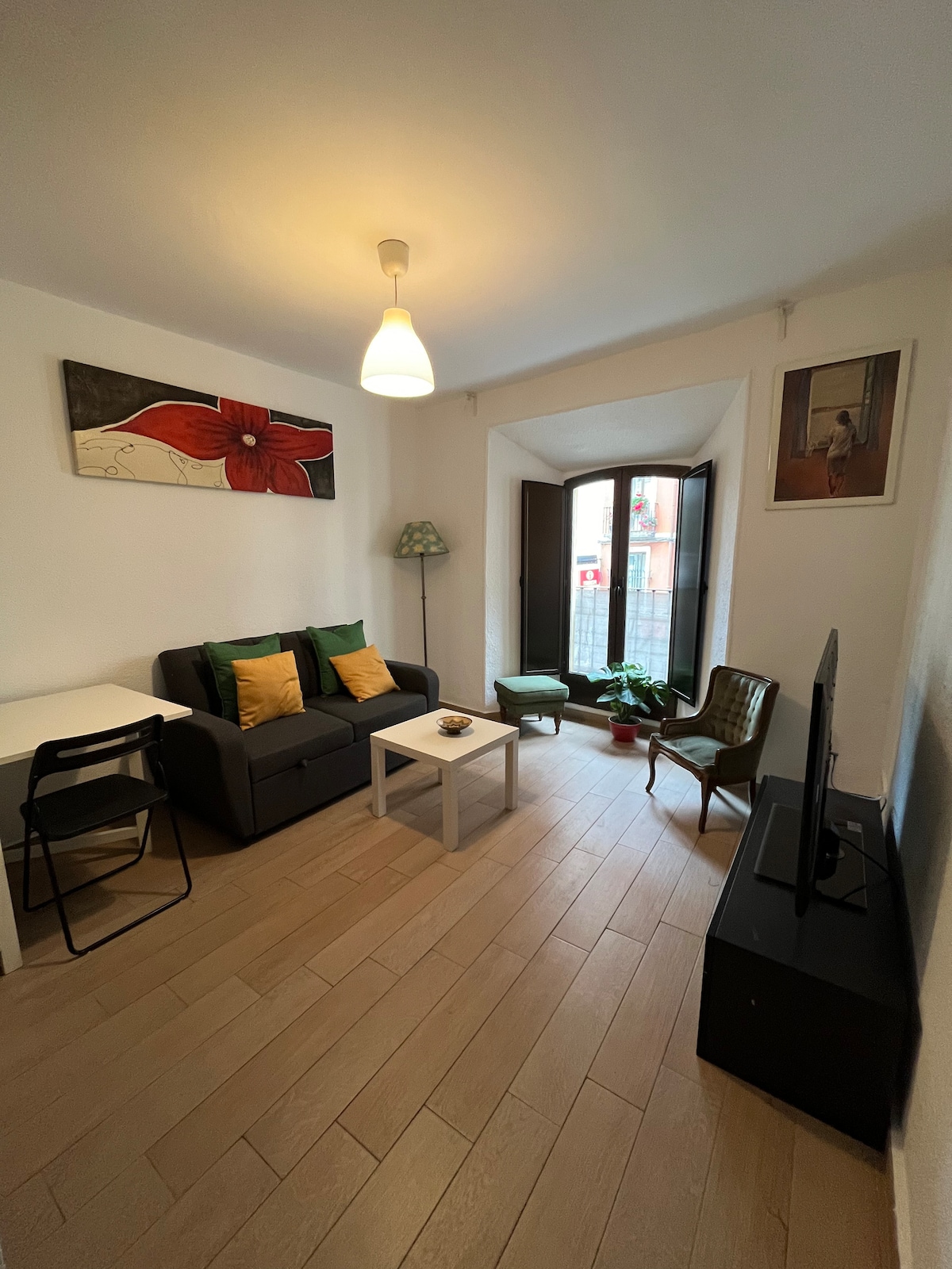 “Vine” apartment is located in Madrid center, off Gran Via, on a quiet street in a new building with elevator. It is nature-inspired, bright & modern, has WiFi, is fully equipped and is very close to restaurants, tapas, the Metro, shops & galleries. Best for a single, couples or couples with a kid! Pets are invited happily!!! The apartment is located in a new buliding, with an elevator! It is modern designed, with lots of greenery, themed to its name, Vine. A huge window along the length of the whole apartment overlooks a beautiful private garden. The apartment consists of a bedroom with a double bed, a living area with a single pull-out sofa, kitchen and bathroom. It has WiFi and is fully equipped, including a washing machine, TV, air conditioning, and Nespresso coffee maker - all just ready for your comfort and enjoyment! The apartment is a studio open space apartment - and it's all yours to enjoy! There are no areas in the apartment that you cannot use or access! We love hosting, but also respect our guests' privacy! We are here for you as much as you would like! Located just off Gran Via in lively buzzing Malasana neighborhood with its great range of authentic cafes, tapas & bars. Huge Zara Primark & Mango are minutes away. Best Madrid sites like Royal Palace, Puerta del Sol & Museums are in walking distance The Central Metro Station Gran Via is a 2 minute walk from the apartment. From there you can take the metro to anywhere you want in Madrid and also to all the train stations that will take you out of Madrid to the rest of Spain. If you come by car, a big parking lot is located at Barco 1, Madrid, just a minute from the apartment. There is also a bicycle-rental station close by. A hosting kit of water, soda, milk, coffee, tea and sweetners will be waiting to welcome you :-)