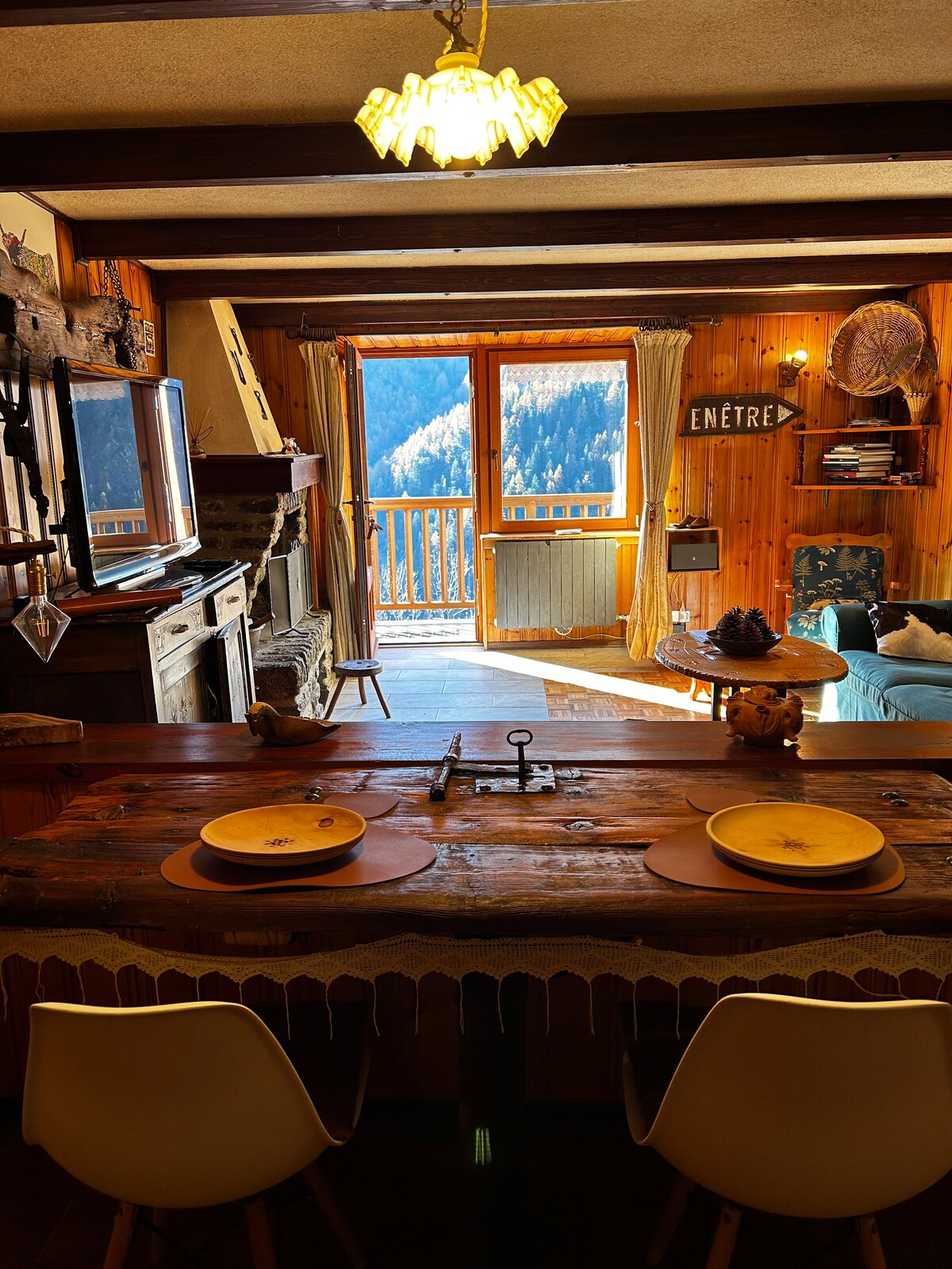 Alps Mountains. Italy. Aosta Valley. A cabin in a small village at 1600 meters,in the peace of meadows, grazing cows and mountains. Snow (usually) in the winter. A place of the heart, lovingly restored preserving the ancient beams of the roof. A wonderful view from the large windows and a special tranquility for those in search of peace, warmth and relaxation. The furniture is very nice: wood above all, but also more lively colors, and modern comforts. Quiet excursions, both on snowshoes or ski.
