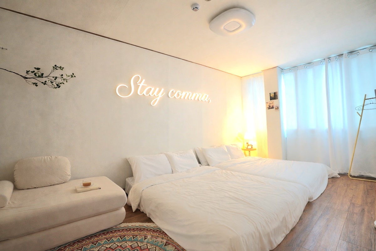 Rett 🌊ved siden av Millet Market kan du se Gwangan Bridge og havet på et øyeblikk! Den har den beste utsikten over Gwangalli, som kan sees foran🌊 Gwangan Bridge. Det er et🌊 pent og hyggelig nytt overnattingssted, med rikelig plass, emosjonell innredning og ulike fasiliteter. Sengetøy vaskes daglig i den beste tilstanden til🌊 hotellklassen. Beliggende 3 minutters gange fra🌊 stranden, kan du bo komfortabelt og komfortabelt fra det støyende sentrum. Gratis parkering er tilgjengelig i🌊 bygningen. 🌊Standard to personer, maksimalt 5–6 personer (topper følger med, sovesofa tilgjengelig, ekstra sengetøy følger med). To 🌊soverom, stue, bad, toalett, vaskerom. 🌊Dusjrommet er adskilt. 🌊Innsjekking kl. 16.00 Utsjekking 12:00 (Det er en oppbevaringsbutikk i nærheten.) 🌊Barnestoler er tilgjengelige:) – Denne eiendommen er registrert og drives som et juridisk selskap for delt innkvartering i hjemmet, underlagt det spesielle tilfellet Mister Mansion!