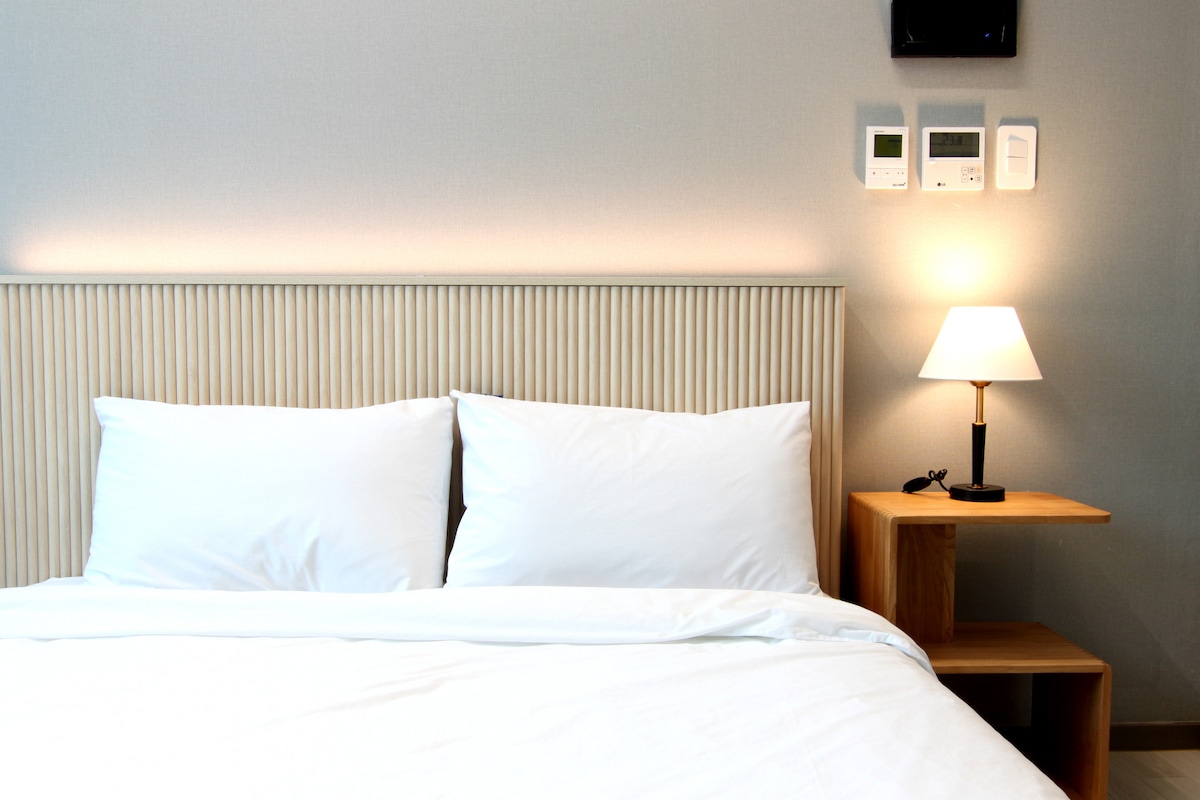 Dette rommet ligger rett foran utgang 3 på Busan Jagalchi stasjon. Queensize-seng er installert, og du kan nyte den vakre North Harbor Bridge og havutsikten fra rommet ditt. Den har den beste utsikten over hele morgenen med klar sjøutsikt. Busans store turistattraksjoner som Beef Square, Kkangtong-markedet og Jagalchi-markedet ligger innenfor gangavstand, noe som gjør det enkelt å reise. Det omkringliggende området er godt utstyrt med ulike fasiliteter som nærbutikker, kaféer, restauranter og apotek. Gratis trådløst nettverk med høy hastighet og døgnåpne sikkerhetsvakter hjelper deg med å holde deg trygg, og alle områder er røykfrie for å opprettholde et hyggelig miljø. Den er fullt utstyrt med kjøleskap, vaskemaskin, smart-TV osv., så den er også egnet for lengre opphold. Sengetøy og rengjøring av rom tilbys for opphold på tre netter eller mer, og vi garanterer en praktisk og trygg tur med kontaktløs innsjekking og tekstkommunikasjon. * Viktig: Det er ingen privat parkeringsplass i denne bygningen, så sørg for å bruke den private parkeringsplassen (JS parkeringsplass osv.), som ligger fem minutters gange unna.
