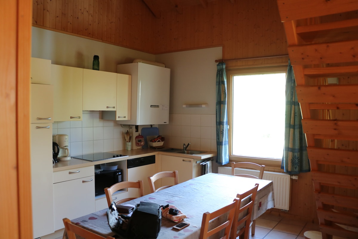 Denne renoverte hytta, bortgjemt i enden av en rolig gate, tilbyr fred og privatliv i hjertet av naturen. Omgitt av skog og åkre, kan du nyte den åpne utsikten og den milde lyden av klokker i det fjerne. Den er ideell for familier eller venner, og har tre soverom, tre bad, et moderne kjøkken, en koselig stue og en balkong med utsikt i to retninger. En garasje for sportsutstyr og et vaskerom med oppvarmet garderobeskap gjør dette unike tilfluktsstedet komplett. Perfekt for avslapning etter en dag med fotturer.