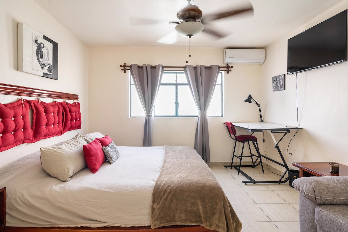 Casitaen er designet for tre personer og har et soverom med kingsize-seng og en enkeltseng i stuen med to TV-er og ett fullt bad. Kjøkkenet deler plass med stuen. Den har en terrasse med en fontene, bord og parasoll. Helt uavhengig. Vi har internett 300 MB med Telmex Infinitum. Privat, ikke overdekket parkering på eiendommen. SPØR OSS OM TRENINGSSENTERET! Vi har en flott avtale! Perfekt for familier, par, besøkende til byen for turisme, konserter, bryllup, arbeid eller medisinske årsaker.