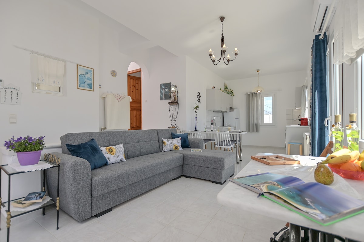 Enestående tradisjonelle greske øyleiligheter med 360-graders utsikt over havet ved solnedgang, tre minutters gange fra hovedstranden på øya, i nærheten av restauranter. Ideelt for par. Ett soverom, innebygd kjøkken fullt utstyrt med moderne utstyr. Det understrekes at leiligheten er helt autonom (egen inngang og overbygd balkong, ingen fellesområder og fasiliteter). Det er ingen risiko for COVID-infeksjon, og streng rengjøring og desinfeksjon utføres etter utsjekking.