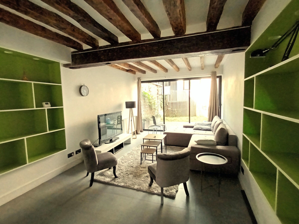 Bienvenue dans notre charmante maison au cœur de Chartres, étoilée et labellisé "Accueil Vélo", rénovée alliant charme de l’ancien et confort moderne. ☆ Cuisine équipée, séjour avec TV et canapé-lit ☆ Chambre parentale, literie haut de gamme, salle de bain avec jets massant ☆ Cour arborée sécurisée, barbecue, stationnement privé ☆ Adaptée aux familles : lit parapluie, chaise haute, jeux ☆ TV connectée, vidéothèque, wifi fibre ☆ Jacuzzi sur demande ☆ Commerces, restaurants, musée a 300 mètres.