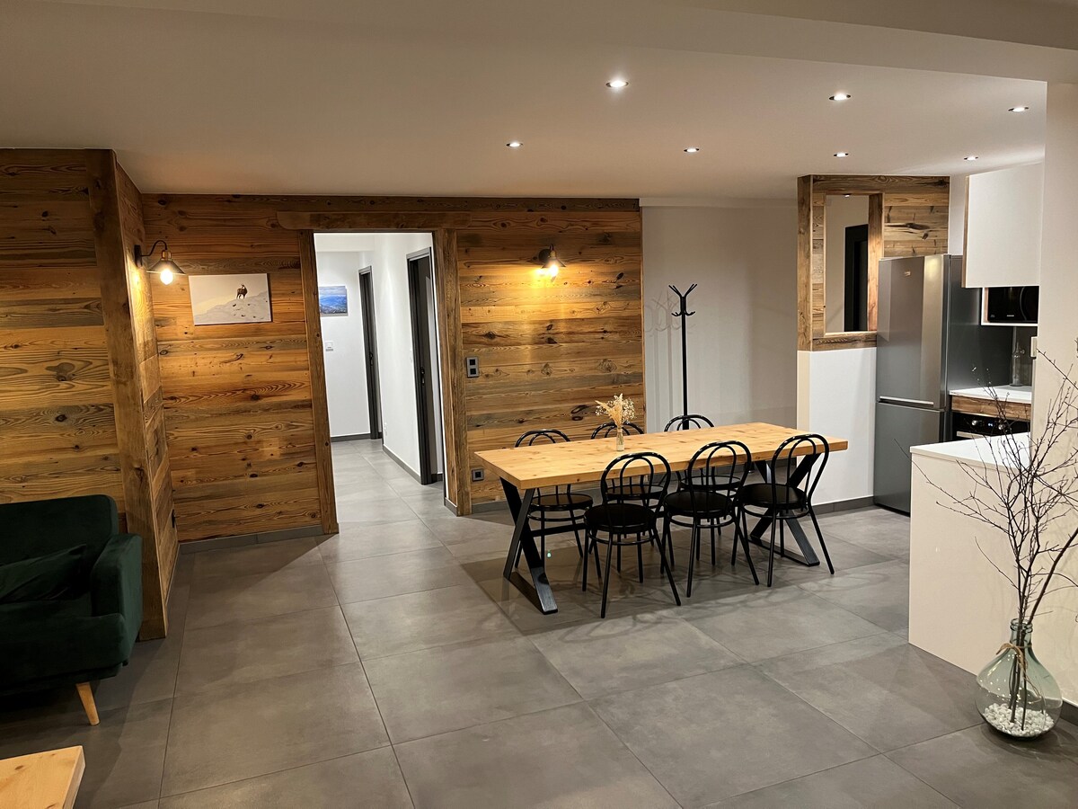 Hytta tilbyr panoramautsikt over toppene fra alle sider. I tillegg til stuen, hvor de store vinduene gir inntrykk av å bo i landskapet, har etasjen 3 soverom (2 lukkede) og et bad, alle med store åpninger for å multiplisere utsikten. Interiøret, en blanding av autentisk og moderne, adopterer hytte-stilen som en rød tråd, i samsvar med det dominerende treverket, som er naturlig. Valget av farger og materialer sikrer en koselig atmosfære.