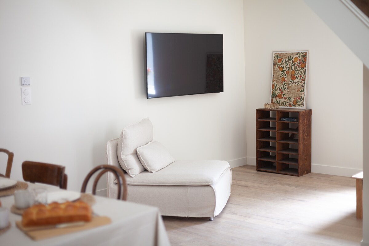 Denne unike overnattingen, som ligger i hjertet av det historiske sentrum av Chalon sur Saône, vil forføre deg med sin franske sjarm med sine eksponerte steiner og innramming og alle funksjonene. Kjøkken utstyrt med vinkjeller, stue med sofa, trådløst nettverk og Netflix. Bad med dusj og badekar Mezzaninsoverom med dobbeltseng, utstyrt med et omkledningsrom og oppbevaringsskuff. Denne loftsleiligheten vil forføre med sitt unike design og gjøre oppholdet ditt uforglemmelig.