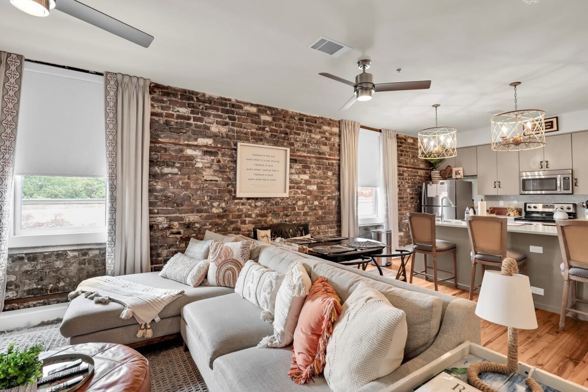 FANTASTISK beliggenhet ved Congress Street • Historisk loft fra 1860-tallet med synlige mursteiner og bjelker • Midt i sentrumslivet: Gå ut i den nydelige byen! • 2 kingsize-senger • seksjonssofa med uttrekkbar soveplass • Vakkert restaurerte tregulv. • Ultrahøye tak med synlige bjelker • Vaskemaskin og tørketrommel (gratis å bruke under oppholdet). • 65 tommers smart-TV i stuen + Roku-TV-er på soverommene Dette er en lisensiert korttidsutleie i Savannah, Georgia. Tillatelse nr. SVR-03218 Lisens SVR-03218.