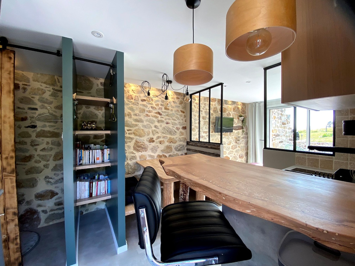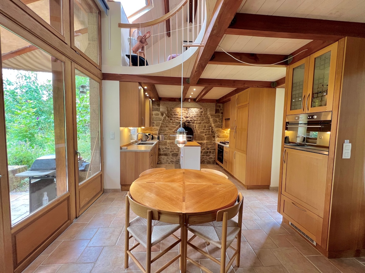Nyhet!!! (Presisjon: spa er tilgjengelig 24 timer i døgnet, det er ingen tid å respektere, og helt privatisert) Typisk bretonisk steinhus i en rolig og grønn landsby. Denne gården har blitt renovert og delt inn i 3 boliger som er helt uavhengige av hverandre. Huset på ca 90m2 består av et kjøkken som åpner seg mot stuen, en stue, to soverom, et bad med italiensk dusj og et spa med 6 plasser i stuen.