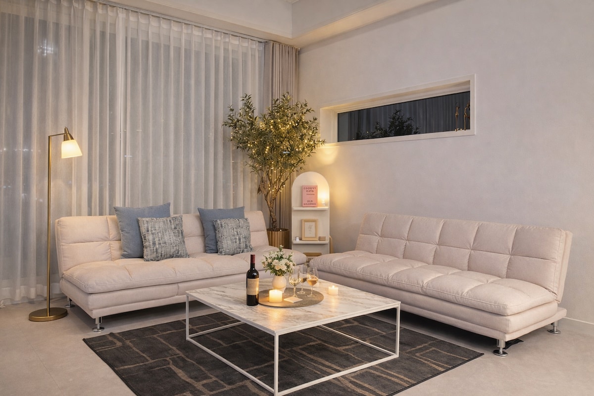 I det insta-inspirerte interiørhuset Nyt grillen og peisen. Det er et skogsopphold med et moderne og enkelt hvitt interiør som understreker raffinement og praktiskhet. I tillegg er det et spesielt sted med et stort rom med 2Bathroom & 3Room & 4QueenBed, og en grillrom som kobles til spising. (Det er en grense for åpningen av rommet og badet avhengig av antall personer, så sørg for å sjekke på forhånd i detaljene). - Absolutt forbudt å gå inn på utsiden av det planlagte antallet personer. Placebo-situasjonen overvåkes til enhver tid av CCTV ved inngangen til hver etasje. Maks antall gjester er 10, voksne eller barn. Åtte tenåringer + to spedbarn under 24 måneder (Inkludert andre besøkende gjester enn 2 personer, 20 000 KRW ekstra per person, gratis inngang til spedbarn) - Grillplassen og peisen innendørs kan brennes. (Ekstra kostnad: 30 000 won for grill/20 000 won for bålplass) - Fullt utstyrt med kald- og varmtvannsrenser, ismaskin, Nespresso-maskin, induksjonskoketopp, betalt vasketårn, ulike matlagingskrydder osv. - vask tårn for klesvask (betalt) Vask + tørking: 10 000 KRW per last Gratis tjeneste: én gang for tre påfølgende netter