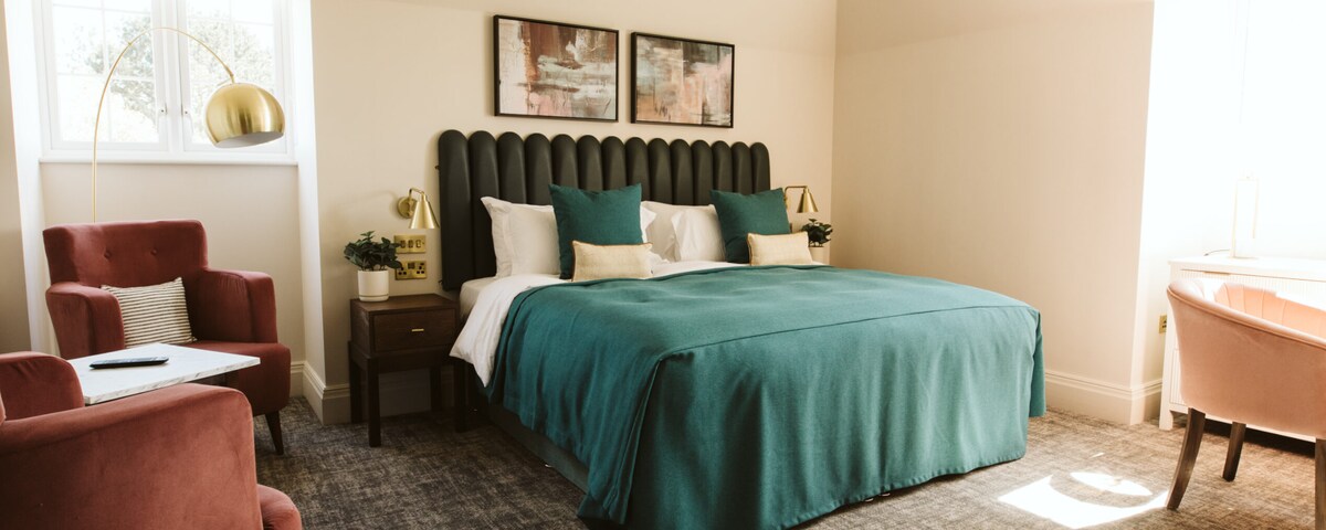 Denne suiten er vårt største og mest prestisjetunge rom på 40 kvadratmeter. Det passer perfekt for nygifte par, par som feirer bryllupsdag eller bare ønsker å komme seg vekk. Axminster Four Poster-suiten ligger i første etasje, sammen med de andre vakre gjesterommene våre. Rommet har en fantastisk håndlaget himmelseng, frittstående badekar, speilbord, sjeselong, LCD-TV og eget dusjrom.