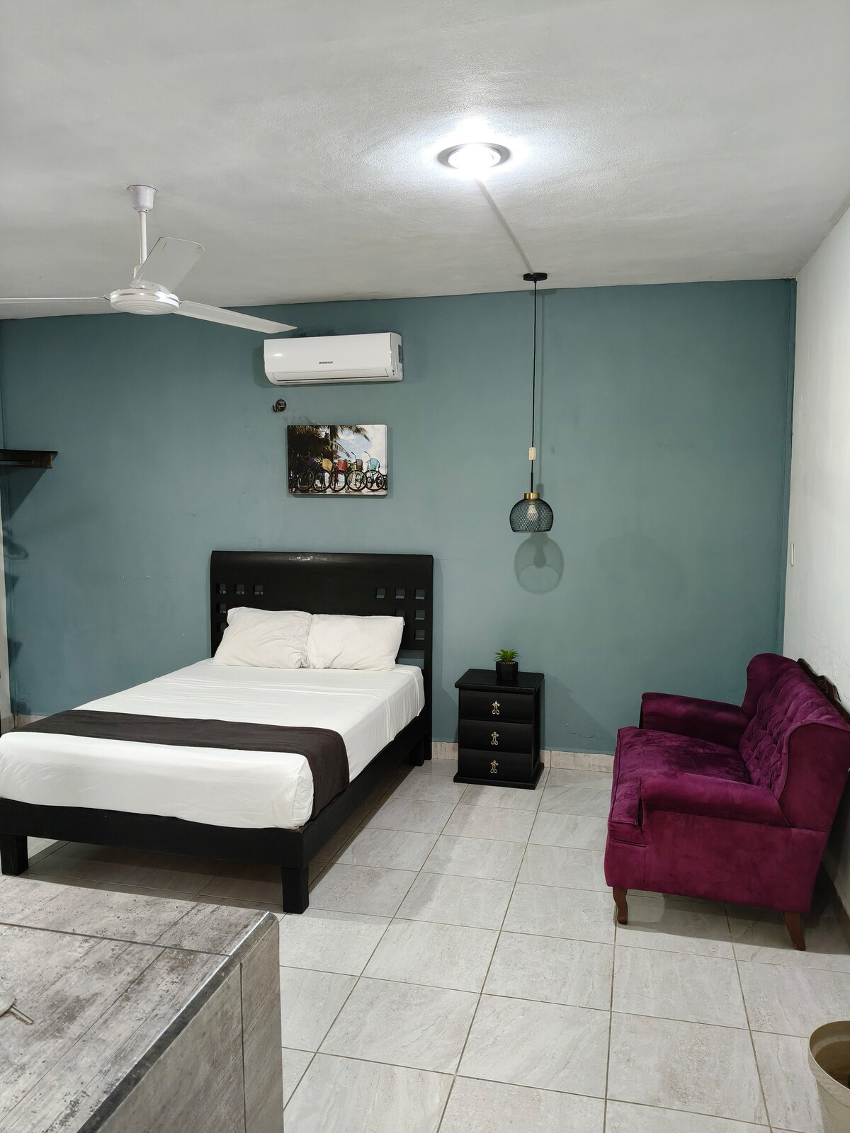 Ideell leilighet for to personer med queen size seng, A/A. Skjerm og eget bad. Airnb har kjøkken og utstyr. Det ligger i andre etasje. Kun for bruk av gjester. Utmerket beliggenhet 3 minutter fra ADO og 5 minutter fra Plaza «Las Américas». Snackbar i første etasje med yucatecanske snacks fra kl. 16.00 til 23.00.