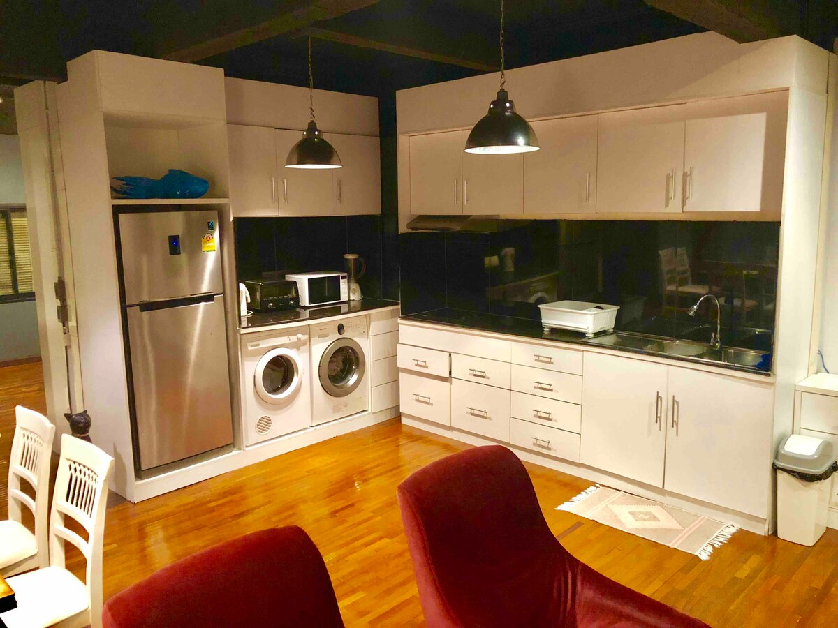Familiesuite - har plass til opptil åtte personer. Bo på et leilighetshotell med 3 soverom og 3 bad og badekar med romslig stue og fullt utstyrt kjøkken. Rommet er industrielt loftsdesign, med eksponert murstein og skinnsofa. Ligger i Waroroj Market District i Chiang Mai by, i nærheten av alt, gatemat, restauranter, barer. Noen få skritt fra Ping-elven, Kina by, fruktmarked. Nyt det ekstra TRÅDLØSE NETTVERKET med høy hastighet.
