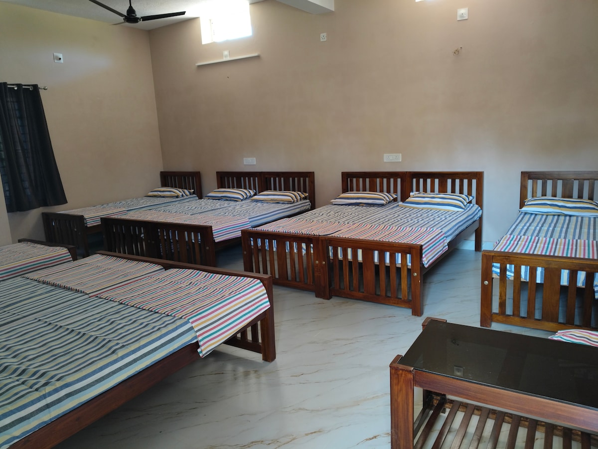 Sovesal med ni senger for grupper på Agumbe Sampada