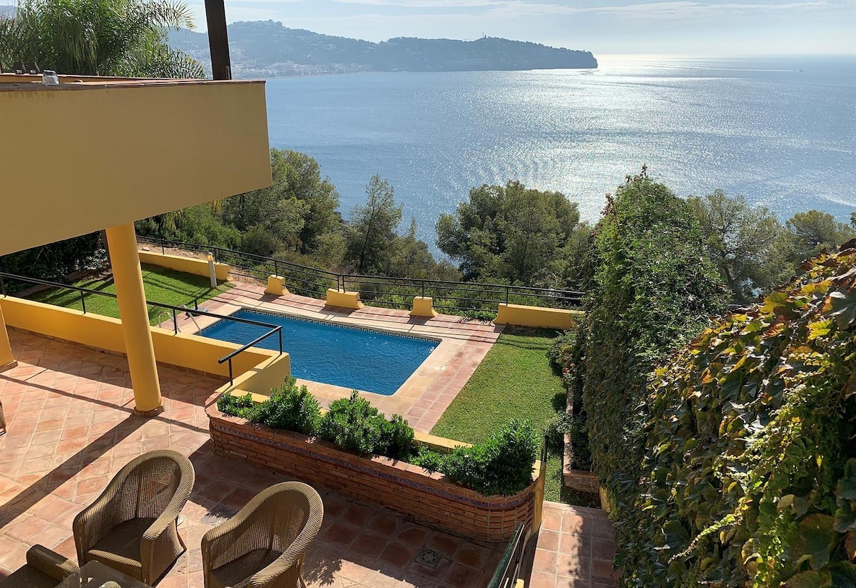 Ditt sjeleplass i Andalusien! Et idyllisk tilfluktssted med et uendelig basseng, utendørs treningsstudio, solterrasse og en stor hage. Det ligger mellom fjellene og havet, og er perfekt for å slappe av og koble av. Bare 20 minutter med bil tar deg til pittoreske hvite landsbyer og stranden. November–mars: Ideelt for sabbatsår eller hjemmekontor. Inspirer kreativiteten din med fantastisk utsikt og raskt trådløst nettverk.