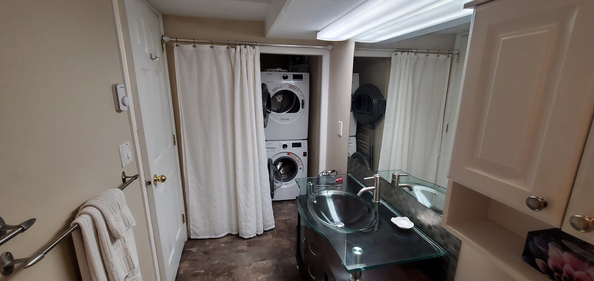 Du vil ha enkel tilgang til alt fra dette sentrale overnattingsstedet. Flyplassen ligger 15 minutter med bil, Hwy#1 og sykehuset ligger 10 minutter med bil, Agrifair ligger 5 minutter med gange, sentrum og shopping ligger 10 minutter med gange eller 5 minutter med bil. Suite har egen inngang og parkeringsplass. Romslig stue med koselig peis, hvor du kan se på Netflix, Prime, Tubi eller kabel-TV. Eget bad med badekar eller dusj på 5 fot. Fullt utstyrt kjøkken med alle apparater, verktøy og servise. Stort soverom med en luksuriøs queen size-seng.