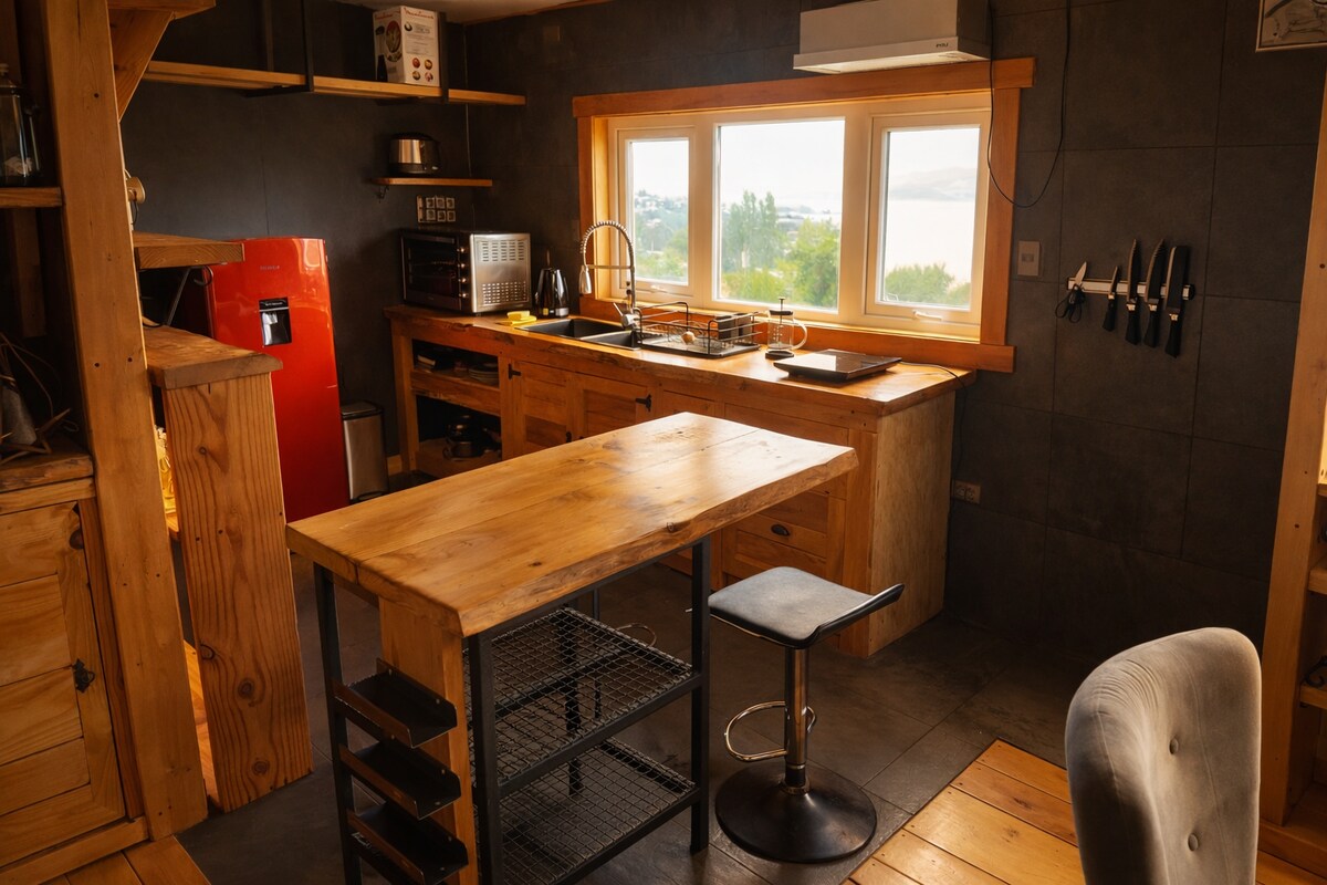 Come stay in a 26 m² tiny house specially designed and handcrafted by us. Fully equipped, it has a common area with a firepit and grill, and a hot tub filled with rain water we collect from our own roofs, which is booked separetely when you get here. La Pichi is perfect for two people with a double bed and can also accommodate a third person on a pouf in the living room. The main space is the living room area with a wood-burning stove and kitchenette, offering panoramic views of the lagoon.