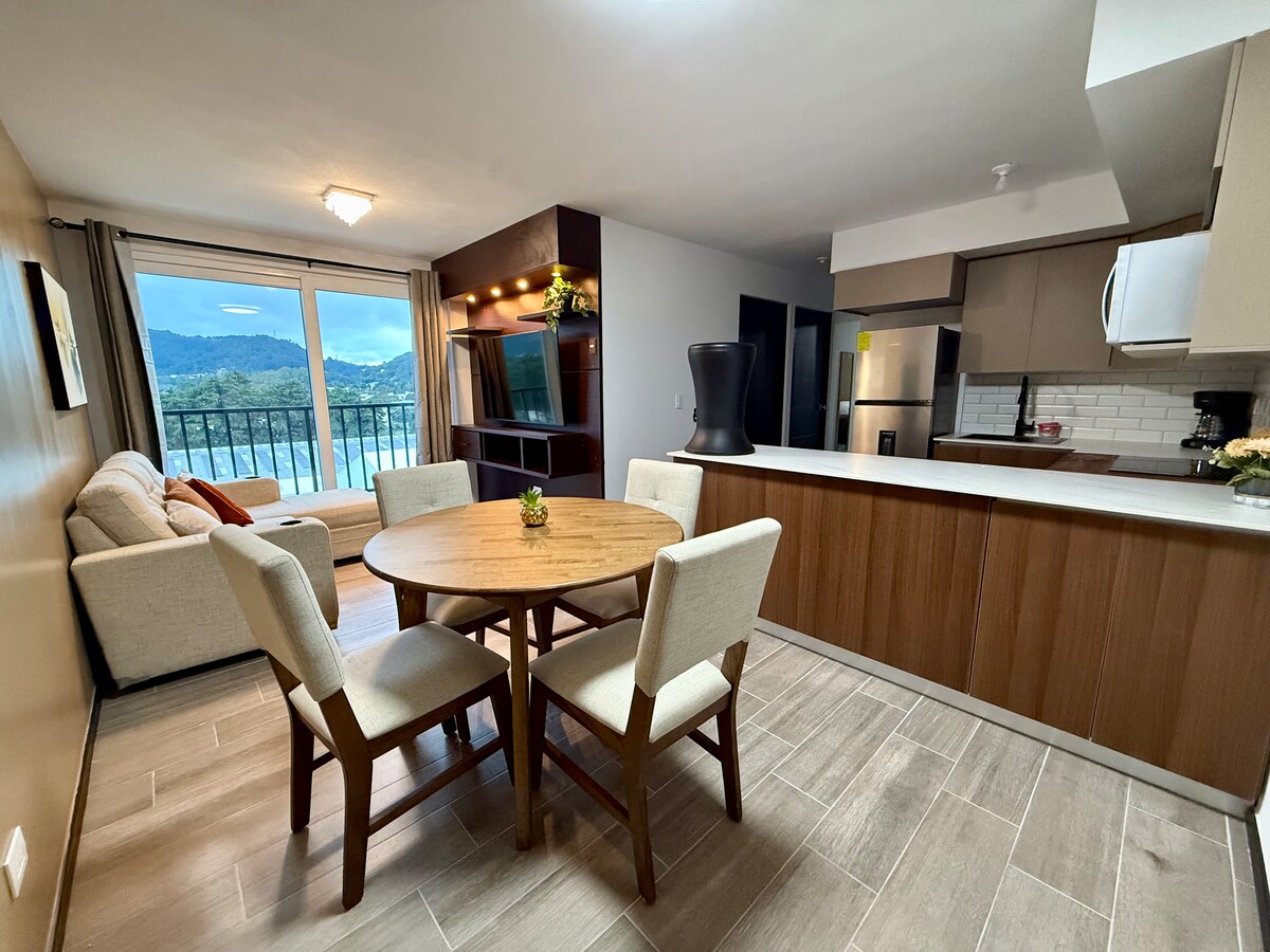 I denne moderne boligen har vi tre soverom, en kingsize-seng og to queensize-senger, en stue, spisestue, utstyrt kjøkken, et bad og balkong med vakker utsikt. Vi inkluderer kokekar, håndklær, sengetøy og noen velkomstdetaljer. Leilighetskomplekset har fasiliteter som et tak med utsikt over vulkanene, hvileområder, baner, treningssenter og lekeplass for barn. Leiligheten ligger 15 minutter fra Antigua Guatemala.