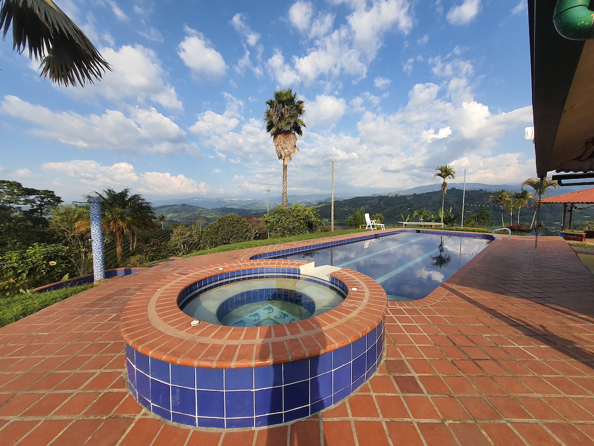 Velkommen til vår fascinerende kaffegård i hjertet av det colombianske kaffelandet i Alto de La Mina, en søt, tradisjonell landsby med utsikt over store plantasjer med kaffe. * Vertene er opptil 20 personer i sine 6 rom * Svømmebasseng, oppvarmet jakuzzi, tyrkisk bad, volleyballbane * Romslige områder for familie- og venners sammenkomster, grill *Perfekt plassert midt i de store attraksjonene i zona cafeteraen. *Fantastisk landskap med kiste, Manizales og Los Nevados