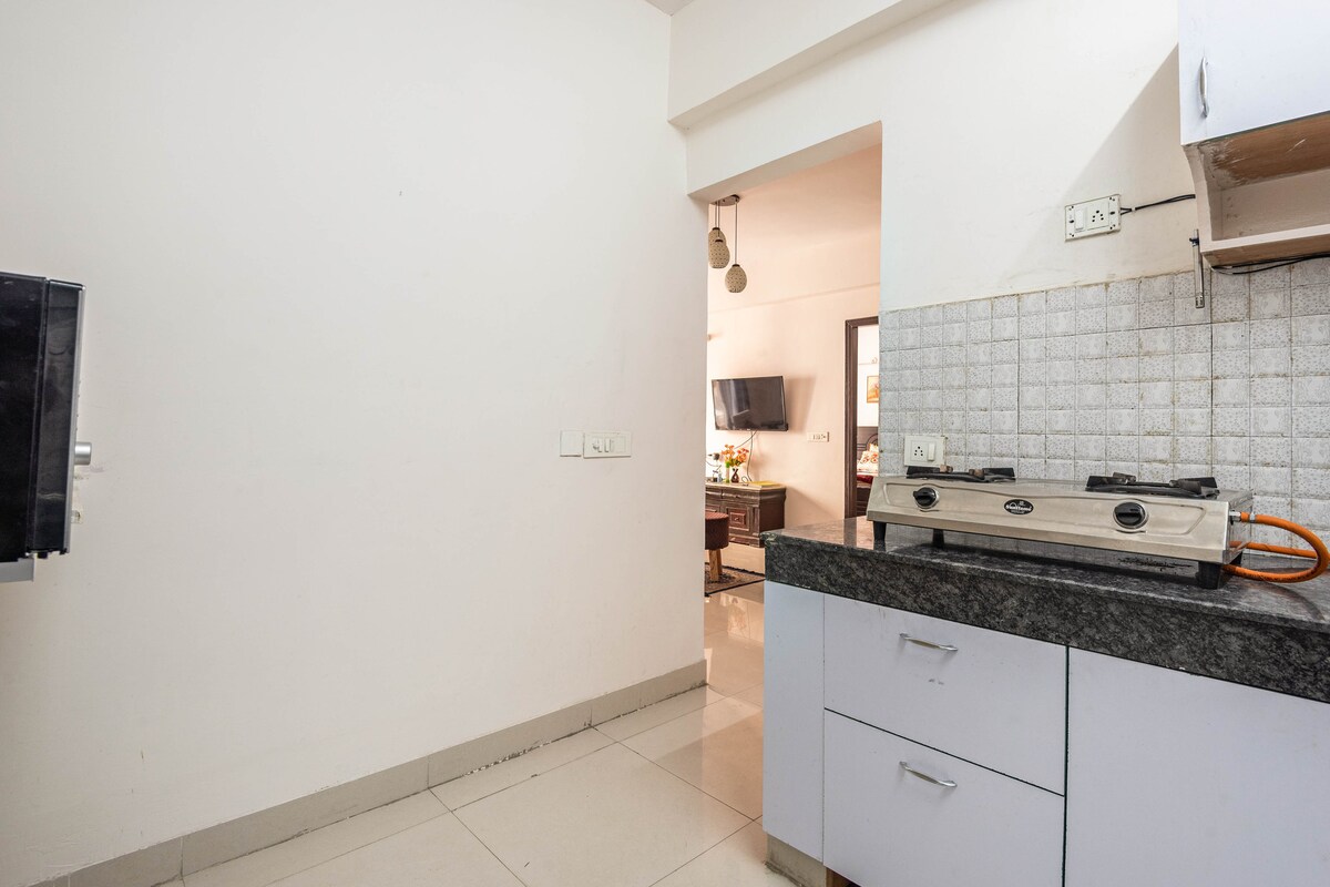 ➽ Romslig 1BHK-leilighet med tilhørende terrasse, fullt klimaanlegg. Alle rommene har 1,5 tonns klimaanlegg. ➽ Solvendt eiendom i et nabolag med høy inntekt, åpen på tre sider, parkvendt og godt ventilert med rikelig med naturlig lys og frisk luft. ➽ Avansert projektor med 25 W soundbar og Amazon FireStick med OTT-apper. ➽ Fullt utstyrt kjøkken med basisvarer for praktisk matlaging. ➽ Slapp av på den fantastiske private terrassen med omgivelseslys og unikt Foger-system for kjøling av terrassen.