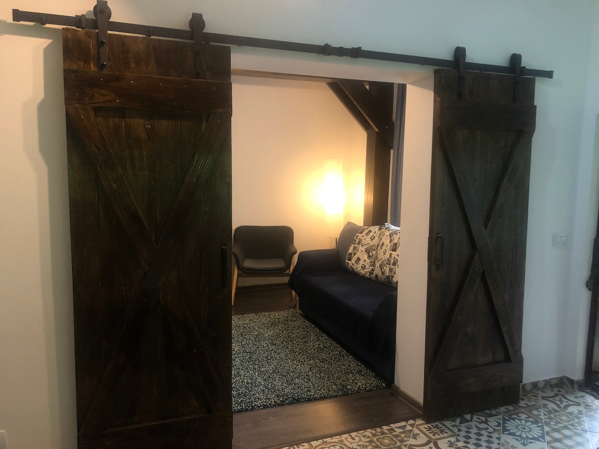 Kjære gjest, huset er veldig rolig, og selv om det ser lite ut, er det nok plass til et par eller en familie med små barn. I første etasje er det et komplett bad, kjøkken og en stor korridor, mens det er et soveområde i andre etasje – stor seng, uttrekkbar sofa, bibliotek, arbeidsbord og tre balkonger (utsikt mot elv, hage og fjell).