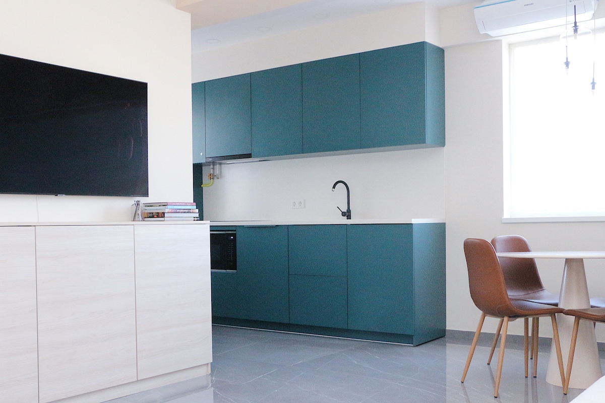 Apartament modern cu o cameră, complet utilat, situat în centrul Chișinăului, lângă un parc liniștit. Ideal pentru relaxare sau lucru la distanță. Wi-Fi rapid, bucătărie echipată, aer condiționat și acces facil la transport, restaurante și magazine. Perfect pentru cupluri sau călătorii solo.