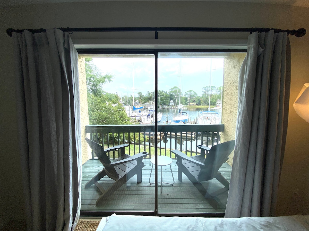 Direkte utsikt over Bluewater Bay Marina, denne studioleiligheten har blitt fullstendig renovert og nettopp oppført. Direkte tilgang fra parkeringsplassen, bakkenivå. Åpen etasjekonsept med en queensize-seng pluss to cabrioletsofaer (perfekt for å ta imot to barn). Terrasse med utsikt over marinaen. Bort fra den travle trafikken i Destin, men likevel 15/20 minutter fra de beste strendene, er det et perfekt sted å bo og slappe av. Nyt marinaen ved siden av med alle fasilitetene:!