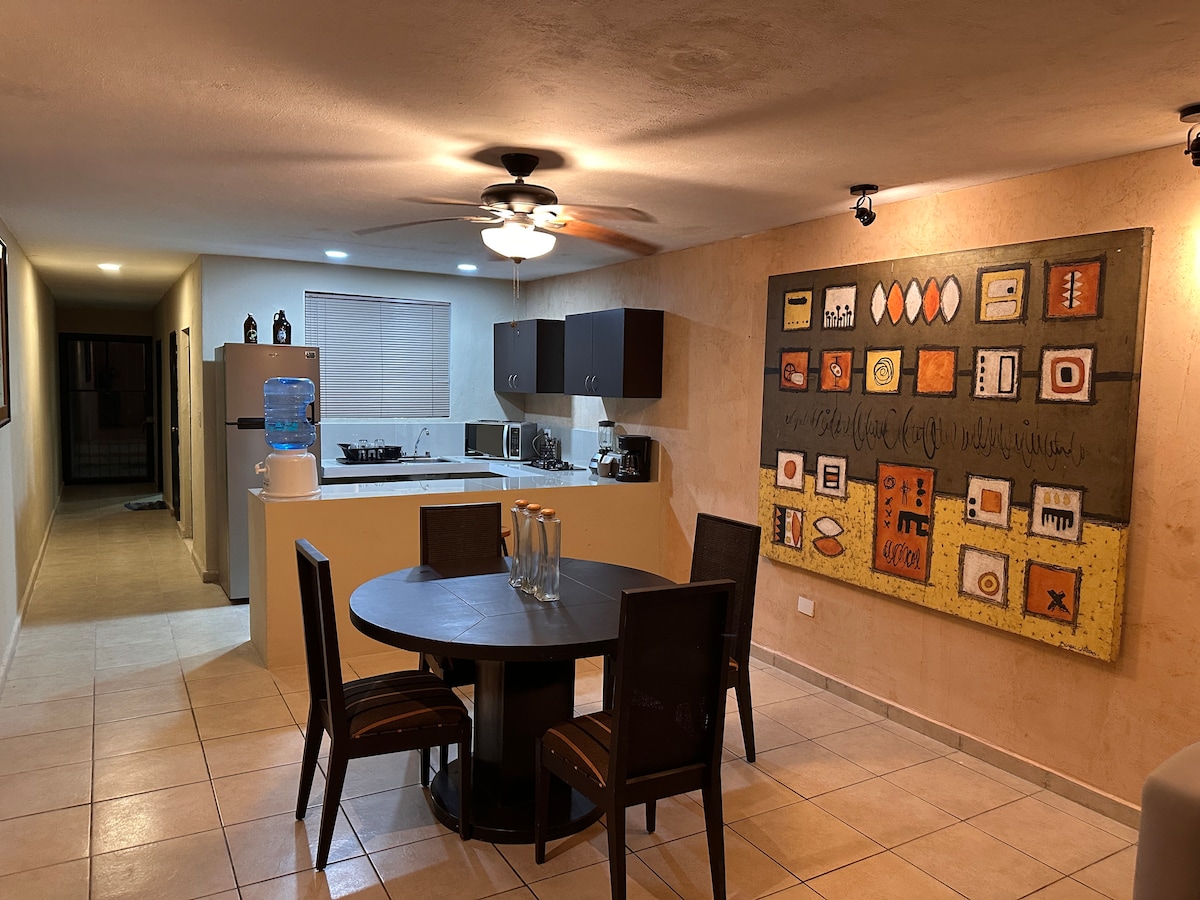 Ren leilighet på et rolig sted for to gjester (maks tre) . Komfortabel hengekøye med dobbeltseng. Tekjøkken, utstyrt med minibar,mikrobølgeovn, elektrisk komfyr, kaffetrakter, servise , strykejern og tørketrommel osv. 5 minutters gange fra oxo nærbutikk. En 10-minutters spasertur til supermarkedet "Soriana" og 15 minutter med lastebil fra shoppingtorget "Altabrisa".