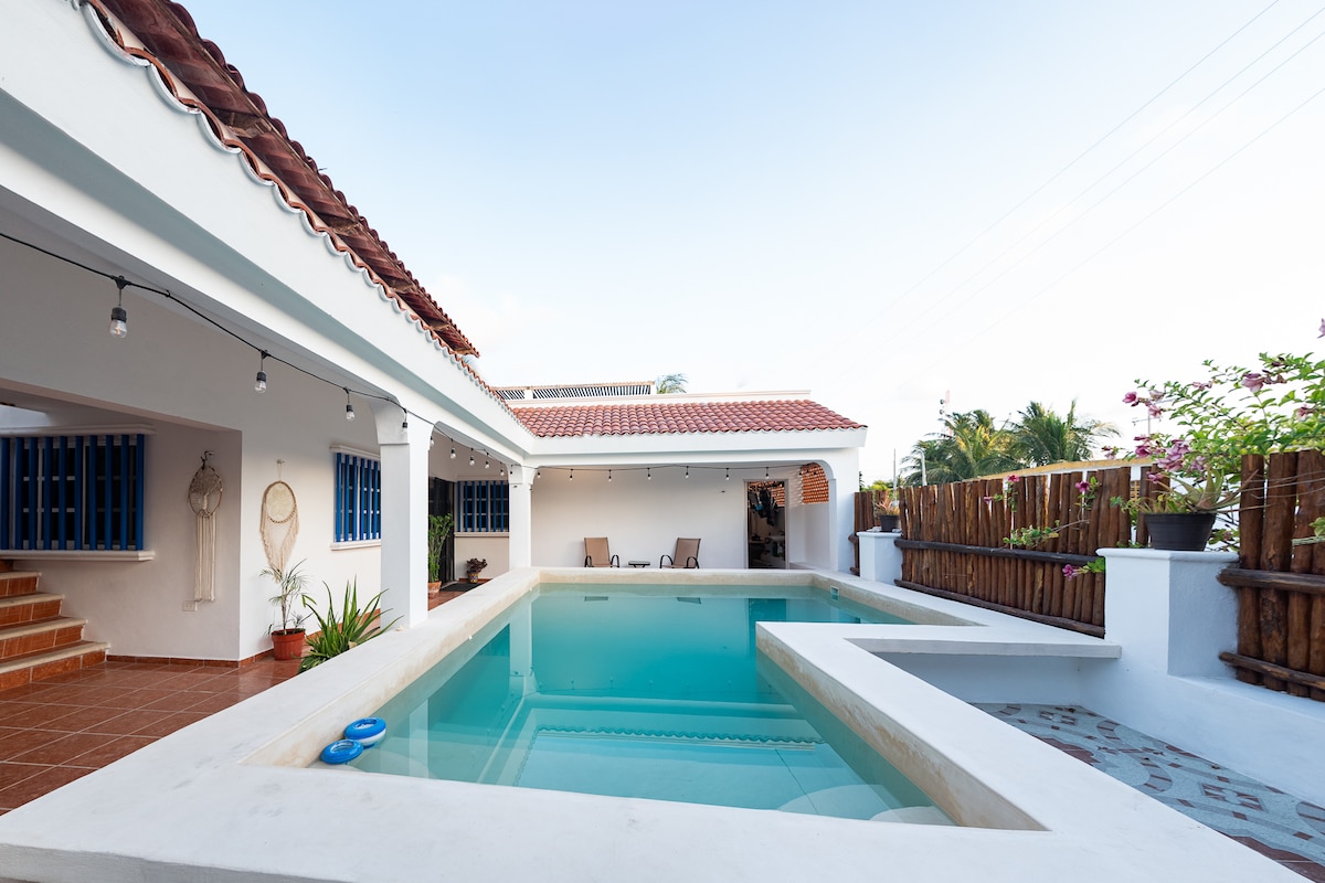 Stilig arkitekturhus med to etasjer, pluss takterrasse. Tre soverom med havutsikt og eget privat bad: ett soverom i første etasje og to soverom i andre etasje. Svømmebasseng med utsikt over havet. Bakgården har mange palmer. Rabatter på ukentlig og månedlig basis. Rengjøring er inkludert. Tre minutter til Farmers Market. 3 minutter til Bistro Maasai Fire minutter til Sayab Bistro. 5 min til treningsrom. Fem minutter til Oxxo. Ni minutter til Cafe France. Ti minutter til Molusk. 14 min til Isla Columpios 15 minutter til Progreso
