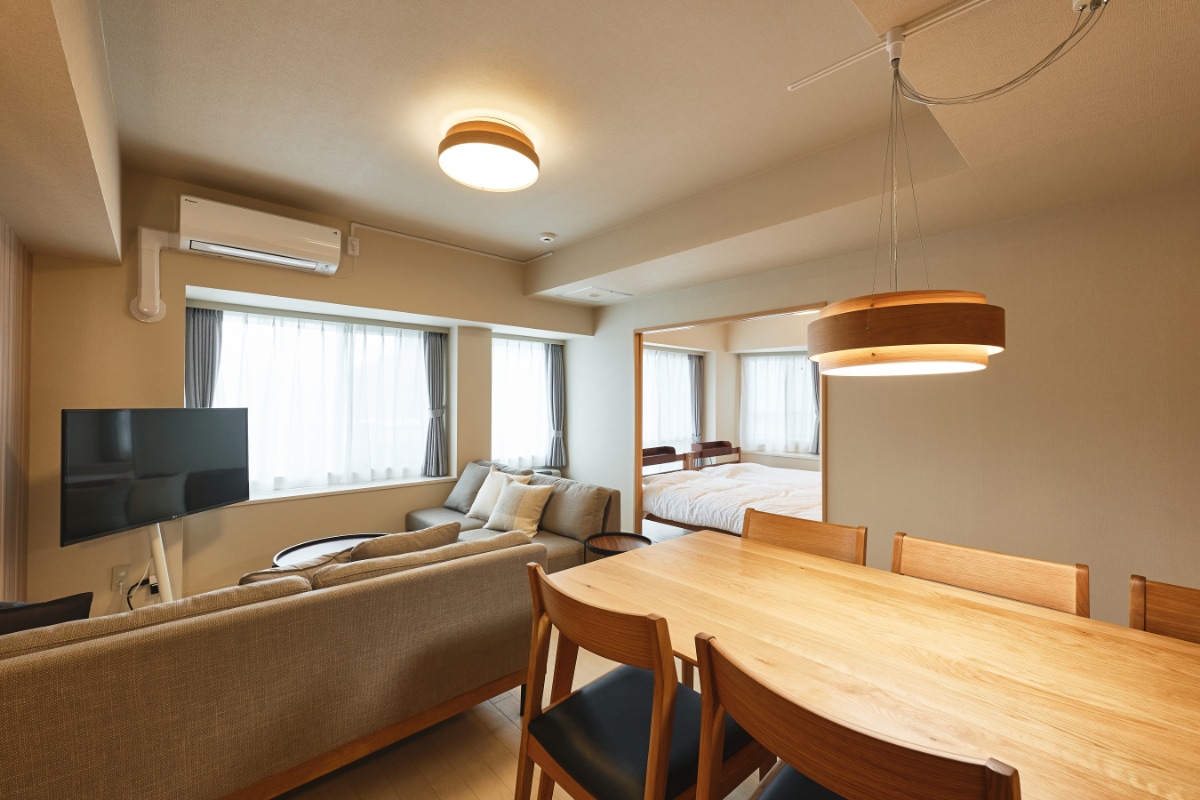 Fully renovated 55 sqm residence in quiet Maruyama, Sapporo. Sleeps up to 5 with free on-site parking for large cars, ideal for families. Diatomaceous earth walls, Simmons beds, two washbasins, hotel-style fragrance, a heat-pump washer-dryer, 100-inch projector and equipped kitchen support a comfortable stay. Access: Sapporo Stn 15 min / Susukino 10 min by car / New Chitose Airport direct bus 84 min / Maruyama-Koen Stn 10 min walk. Host lives in the building and can help with luggage.