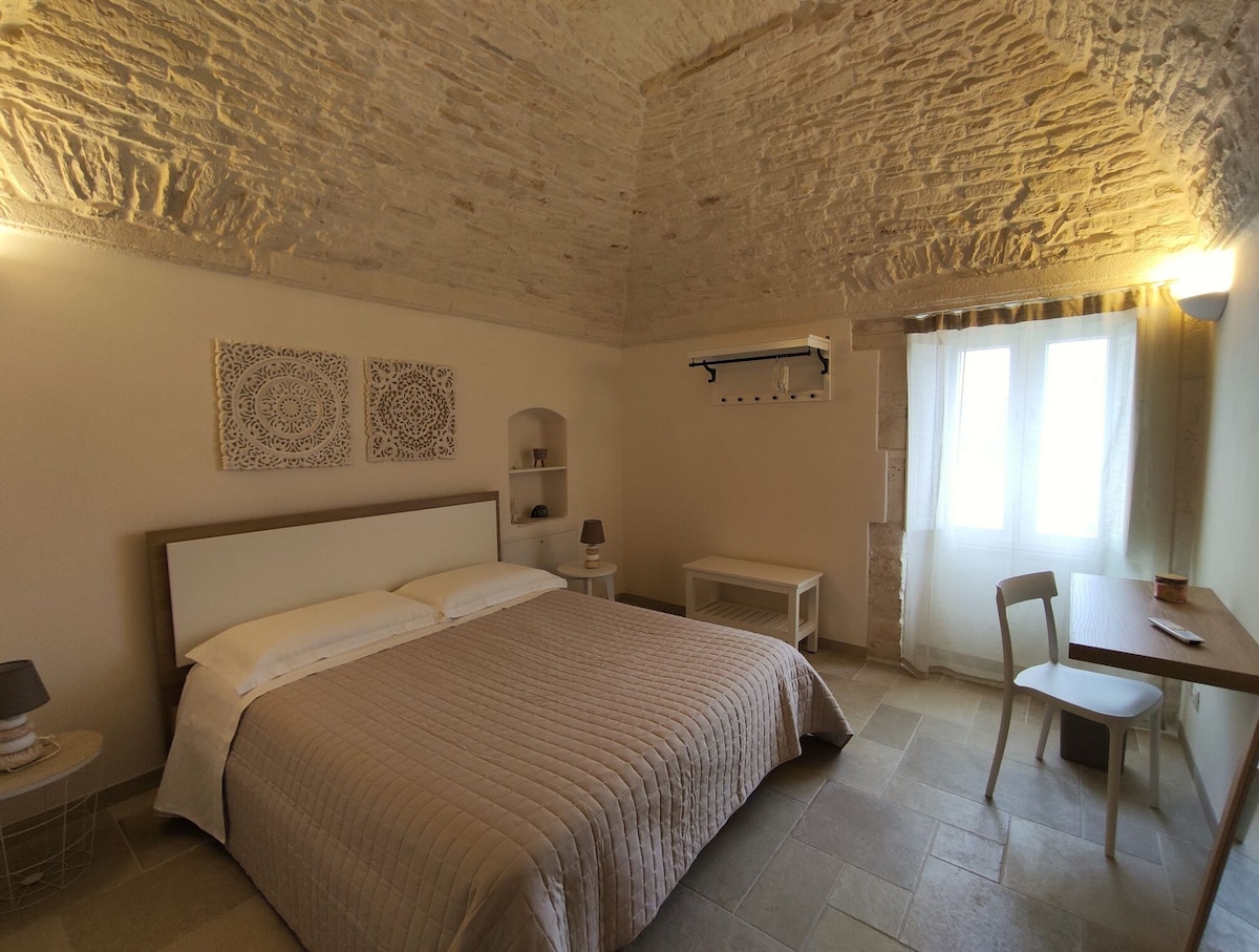 Huset er en trullo fra 1800-tallet, totalrenovert, utstyrt med oppvarming og klimaanlegg, smart-TV og trådløst nettverk. Soverommet er utstyrt med en dobbeltseng med nattbord, leselamper og en garderobe. I rommet, som er utstyrt med kjøleskap, mikrobølgeovn, brødrister og espressomaskin, er det en sovesofa. Du kan lage mat og spise ved et bord for fire personer. Fra rommet har du tilgang til badet, som er utstyrt med en vaskemaskin, varmt vann, alle toalettartikler, vask, bidet og dusj med kabin.