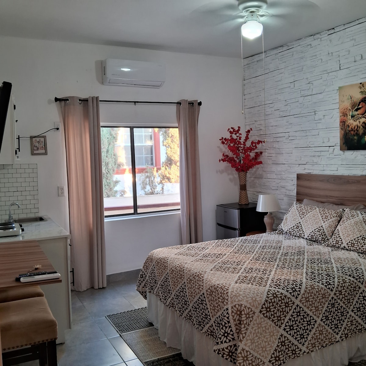 Ideal para una o dos personas. - De 10 a 15 minutos del consulado. - Minisplit frío y calor - Spot Lights - Piso de porcelanato. - Recién remodelado. - TV - Wifi - Agua caliente -Netflix CHECK IN, CHECK OUT: - El Check in es a las 13:00 hrs, es posible ingresar antes si no hay huéspedes en ese momento y el departamento se encuentra limpio - El Check out es a las 11:00 a.m.,flexibilidad de ampliarlo si no llegan huéspedes ese mismo día. NO EXPEDIMOS FACTURAS.