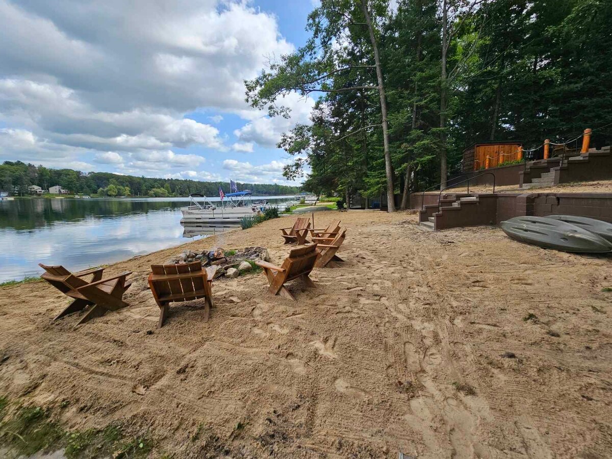 Ren Michigan-opplevelse starter med en liten Paradise Lakefront Cottage pluss ekstra bonus! Kjærlighetsskuret! Enorm strand privat! Krystallklart vann!! Svømming, soling, flytende på innsjøen! Utebranner på en strand, stjernene er nydelige om natten ved siden av lysthuset med dobbeltseng. seng!! utendørs tiki-bar!! veranda med piknikbord! Grill. Har en stor brygge på 3 x 30 fot. Ta med din egen båt. Jetski på innsjøen. Kobler til fem forskjellige innsjøer. Det følger med fire kajakker gratis! Cruise rundt i innsjøene!