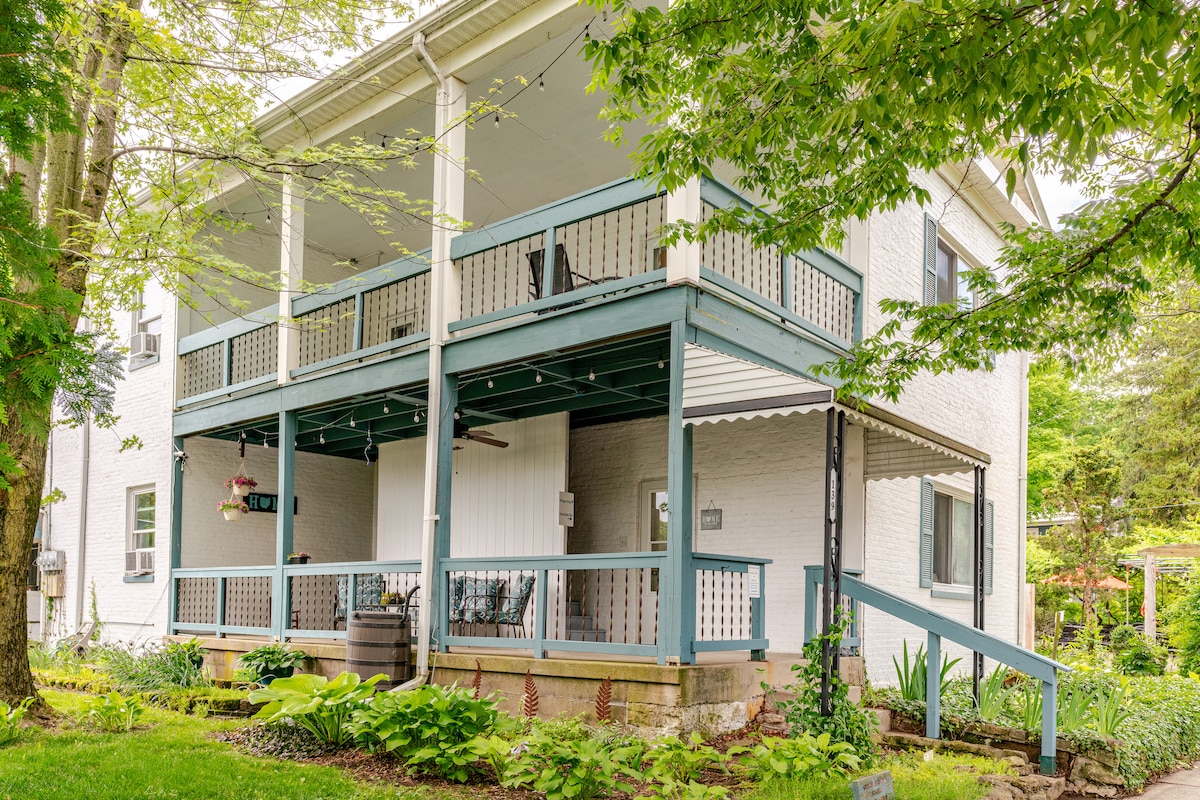 RIGHT IN DOWNTOWN YS, this historic home built in 1866 houses two airbnb units. The Village Vista accommodates five guests & is a light filled 800 sq foot second floor unit with two bdrms, each with a queen bed & ac window unit. The second bdrm has a twin bed as well. Full kitchen, dining & living rm. Smart t.v. with Netflix & WiFi. The covered patio with table & chairs is one of the best features allowing a view. Steps to EVERYTHING; The bike path, Y.S Brewery, The Winds, Glen Helen.