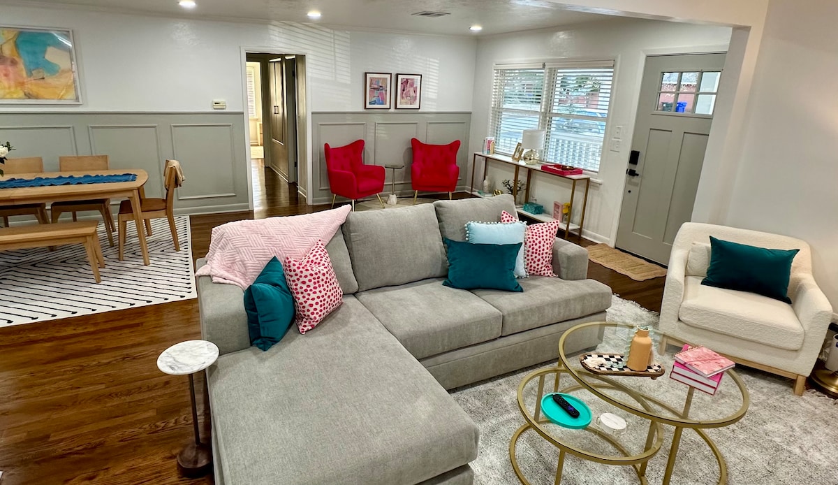 Designet for å ha alle ekstrautstyr som et fint hotell, men med følelsen og plassen til et hjem. Dette er stedet ditt å hygge deg, slappe av og nyte! Dette hjemmet ligger på et hjørne i et familievennlig nabolag, og har fullt kjøkken, to terrasser og en helt lukket bakgård. Bålplass og gratis s'mores er også dine, i dette nydelige, komfortable hjemmet.