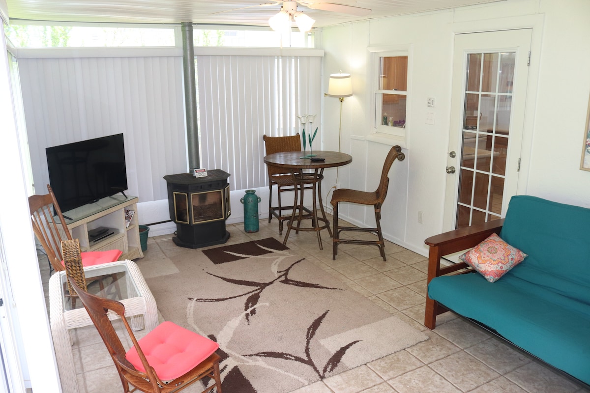 Koselig hytte med åpen planløsning med dekket veranda med utsikt over den lille dammen på eiendommen vår. Unikt innredet. Utsikt over skog og åkrer, men nær mange restauranter, parker og turstier og TRAX Farms. Trolleybussen til Pittsburgh ligger to minutter unna. Hvis du trenger overnatting, send meg en melding for å ta hensyn. Vurder også «Mojo's Loft», vårt kjæledyrvennlige utleiehjem, eller Jackson Hill Cabin, vårt tømmerhus med tre soverom og et biljardbord.