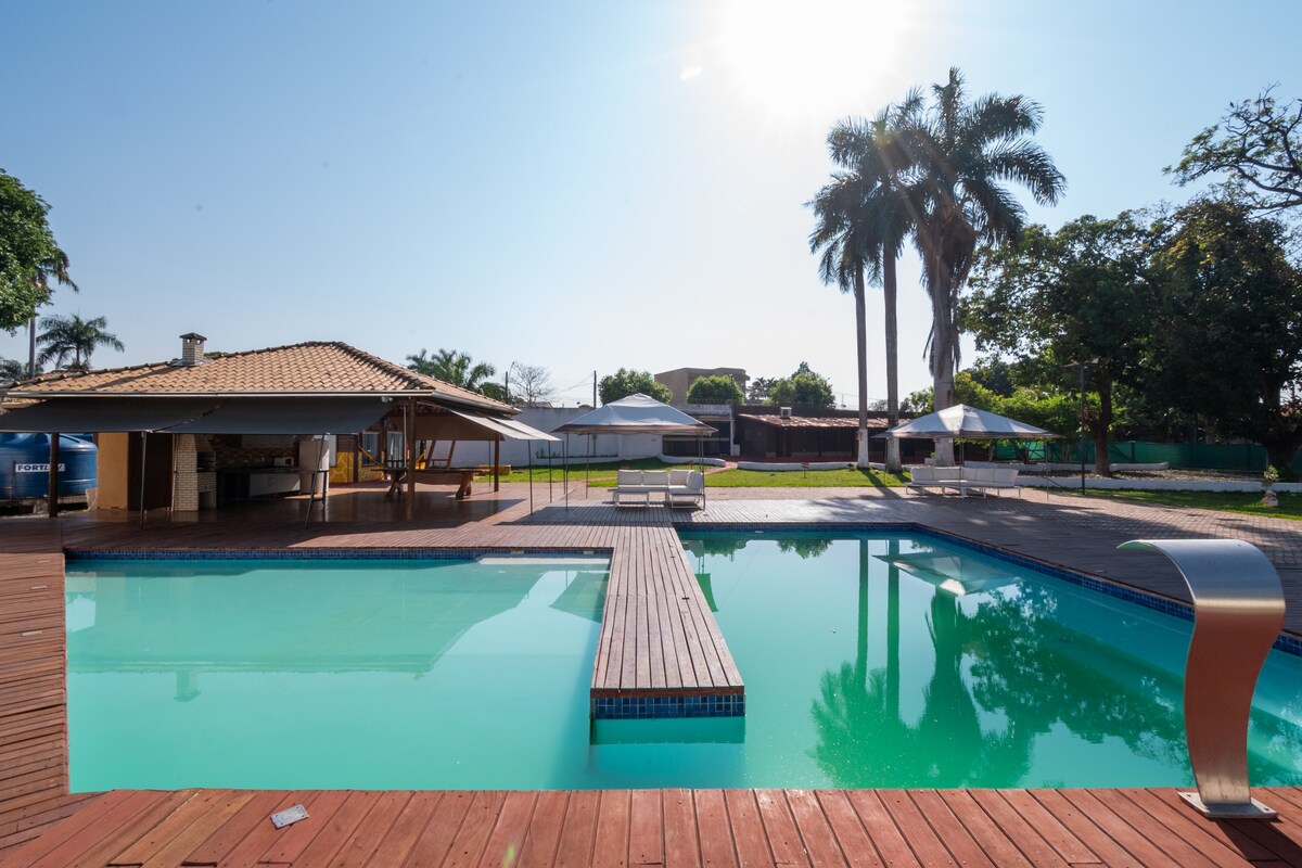 Hvis du vil ha et sted å hvile som er veldig forskjellig fra arbeidsrutinen din og mursteinshuset/leiligheten din, er Recanto Jaó stedet for det. Koselig stort eukalyptustre. 5000 kvm grøntområde med svømmebasseng, grillplass, seks soverom og seks bad, 20 sengeplasser, 20 i ekte senger pluss trådløst nettverk, gårdsfamilie, gjenforening, venner, i dette naturlige paradiset, fugler osv. Hvil deg, ha det gøy, trygt miljø i et eksklusivt nabolag i Goiânia.