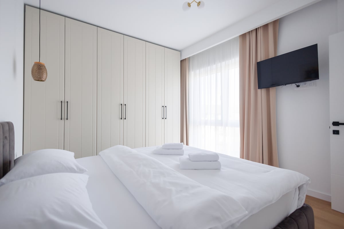 Ny luksuriøs, romslig leilighet i sentrum av Cluj, med gratis parkering og terrasse. Denne nye leiligheten, en del av et nytt boligkompleks, ligger 400 meter fra Avram Iancu-torget, Nasjonalteateret og Orthdox-katedralen. Du kan nyte Netflix-serien Full HD mens du nyter en kopp kaffe på balkongen. Sterkt trådløst nettverk døgnet rundt (1000 mbs). Det er alt i nærheten, inkludert restauranter, kaffebarer, puber, kjøpesenter eller offentlig transport. Alt er nytt inne. Enkel innsjekking uten vert