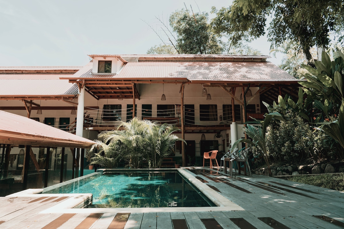 Ritmo Tropical Hotel ligger veldig nær stranden. Bare en kort spasertur unna. Med ti bungalower og private rom omgitt av jungelen, med alle slags fugler og en vakker hage. Nyt en fersk frokost hver morgen, en kjølig dukkert i bassenget og ta en morgentur langs stranden. Bare en kort spasertur tar deg til et av de viktigste surfestedene i byen. Også lokale butikker, restauranter, barer og mye mer! Vi tilbyr privat parkering og sikkerhet døgnet rundt. Kos deg i Santa Teresa! Pura Vida!