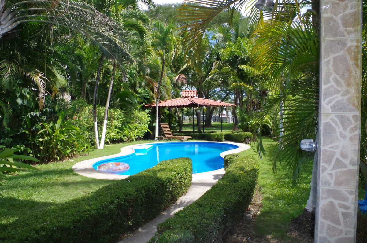 Velkommen til der Costa Rica-jungelen møter strandliv. Nyoppusset villa med 2 soverom/2 bad med privat basseng som støtter på golfbanen. Ha drømmende turer i Los Delfines gated community som føles som om du går i en dyrehage mens du nyter det lokale dyrelivet. Nyt soloppgangen tidlig om morgenen på en av de beste turstrendene i Costa Rica, golf, pickle ball, tennis, fuglekikking, yoga på stranden, karaoke, salsa eller magedansundervisning på Beach Bar.