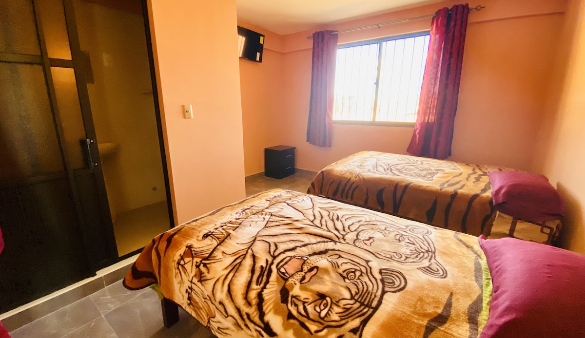 Disfruta de una habitación familiar cómoda y espaciosa para 3 personas, ideal para viajes en familia o grupos pequeños. Cuenta con 2 camas, 1 cama queen y otra cama twin, baño privado amplio, equipado con artículos de aseo para tu comodidad, además de TV cable y WiFi de alta velocidad, perfecto tanto para descanso como para trabajo o entretenimiento. Su ubicación es excelente: a solo 3 minutos del Campo Ferial FEXCO, ideal si vienes por eventos, ferias o actividades en Cochabamba.