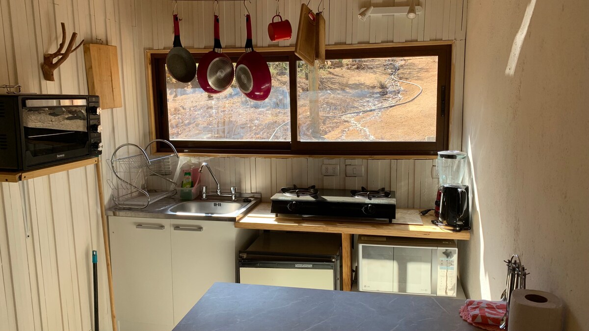 Privat rustikk-modern hytte som ligger to kvartaler fra Plaza de Pisco Elqui, i nærheten av restauranter og bedrifter. Privat parkering. 1 soverom med eget bad, 1 dobbeltseng (sengetøy, tepper, dyne, puter og puter). 1 nattbord, 1 lampe, 2 sengebord, sofa, restaurert antikk møbel og 1 Bluetooth-høyttaler. 1 elektrisk ovn for vinteren. Kjøkken, oppvaskmaskin og minibar på terrassen (gryter, servise, bestikk, vannkoker, osv.) og kullgrill. Det er mye vegetasjon rundt.
