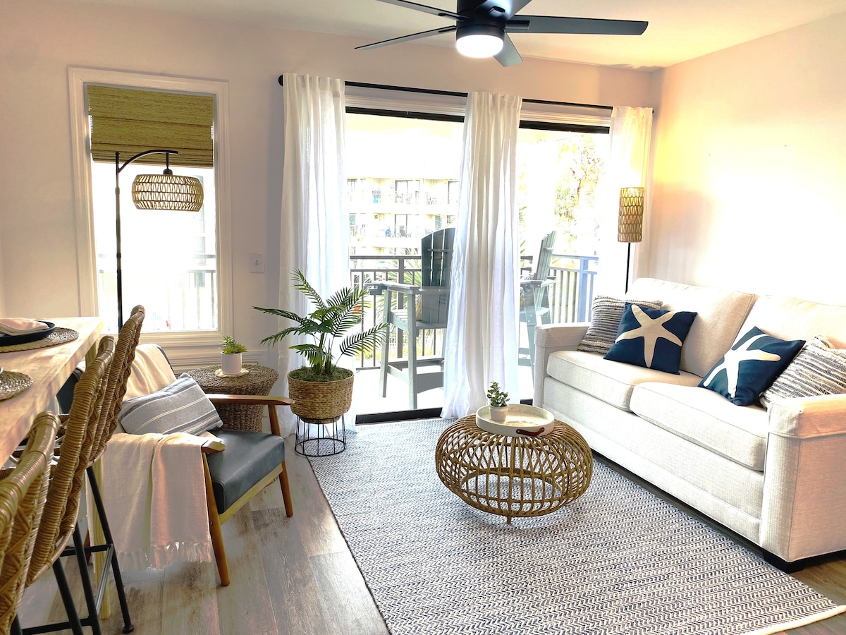 Nyoppdatert Sands Village-leilighet ett kvartal fra stranden. Nyt ferien din med oppdatert innredning, nye møbler, bomullslaken og organisk/naturorientert innredning. Denne leiligheten har en søt balkong med utsikt over bassenget, et flott sted å slappe av, ta en drink eller lese en bok. Du er bare ett kvartal fra stranden og bare noen skritt fra Coligny Plaza, som har en dagligvarebutikk, bakeri, iskrembutikk, restauranter, kafé og mange andre gavebutikker.