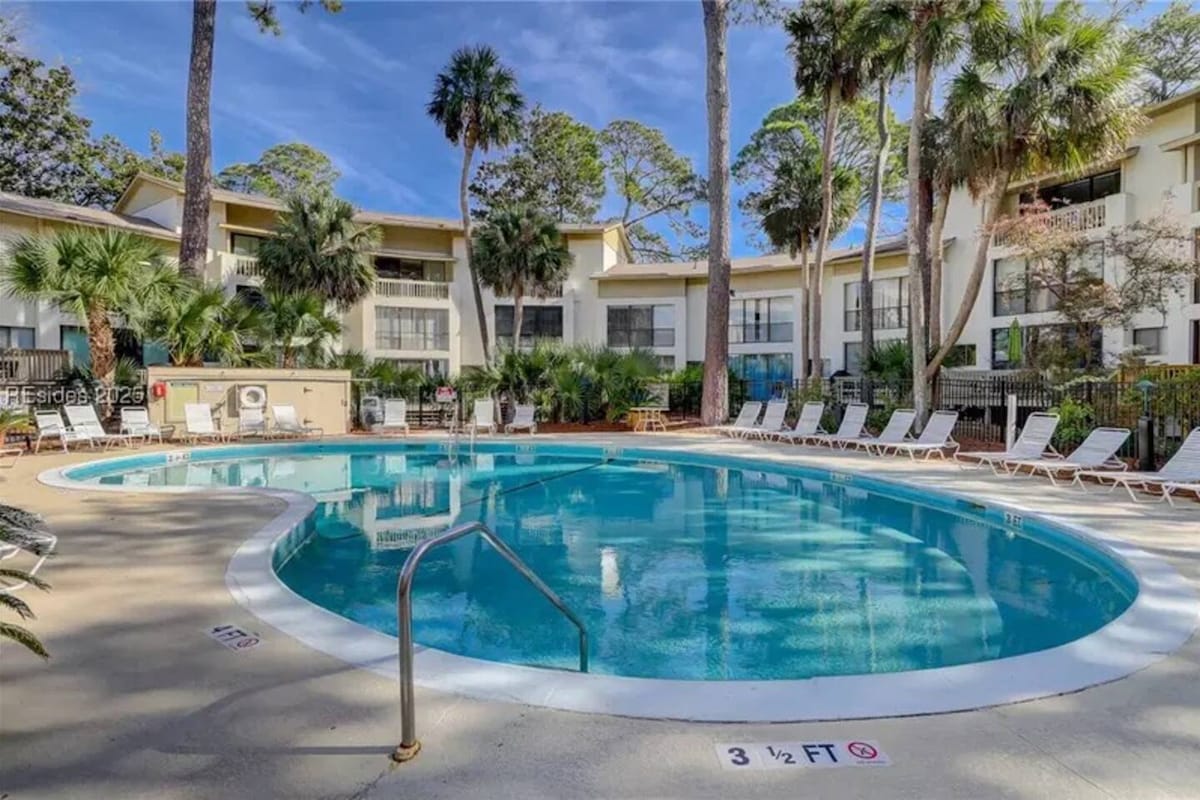 Denne koselige kystleiligheten ligger bare noen skritt fra sandstranden og har en privat balkong med havutsikt fra siden. En kort spasertur til Coligny Plaza, et levende område med en rekke sjarmerende kafeer, restauranter og butikker. Det inngjerdede komplekset har basseng, solterrasse og fellesgrill – ta med eget grillkull. Høyhastighetsinternett, GRATIS TRÅDLØST NETTVERK, smart-TV-er – du er alltid tilkoblet. Nyt hjemmets bekvemmeligheter med et fullt utstyrt kjøkken, en luksuriøs kingsize-seng, ideelt for hjemmekontor, moderne oppgraderinger og inkluderte fasiliteter.