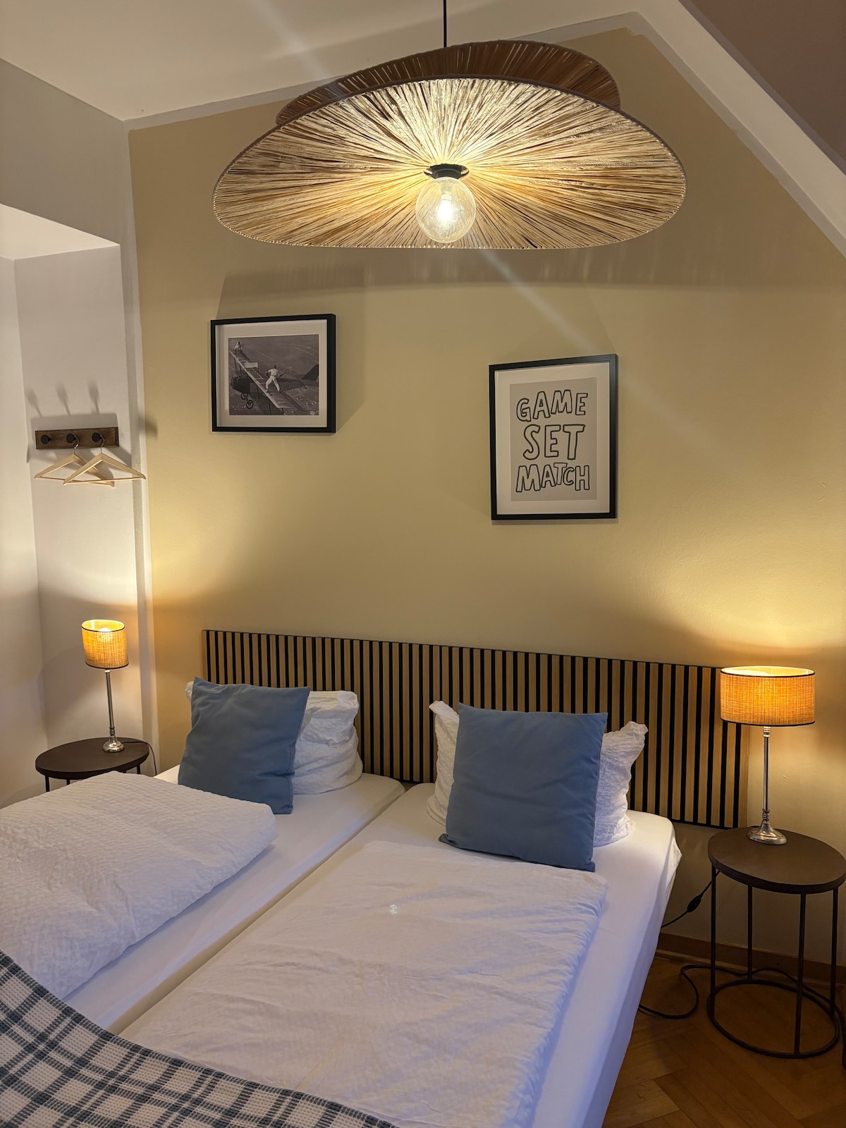 Velkommen til Ruby Leni, hvor avslappede vibber møter Düsseldorfs rike teaterhistorie. Vårt sjarmerende Nest-rom (14–16 m²) er perfekt for et kort opphold alene eller et koselig tilfluktssted for to. Den 160 cm brede, ekstra lange sengen med luksuriøst, overdimensjonert sengetøy sikrer avslappende søvn. Nyt et superstille klimaanlegg, raskt trådløst nettverk, en Marshall-forsterker og en forfriskende regndusj med Ruby Care aromaterapiprodukter. Bymyten er inkludert i prisen.