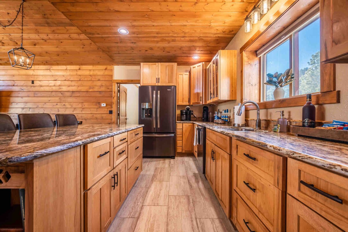 Et hjem med fire soverom som ligger blant trærne. Romslig planløsning med vedfyring. Fullt utstyrt kjøkken, møblert med apparater i rustfritt stål og Keurig-kaffemaskin. Samles rundt spisebordet, eller ta det utenfor til verandaen med grill + boblebad. Hovedsoverom i første etasje med koselig kingsize-seng og jacuzzi med privat tilgang til terrassen. Garasjetilgang sammen med vaskemaskin/tørketrommel. 10 minutter fra fasilitetene i Breckenridge.