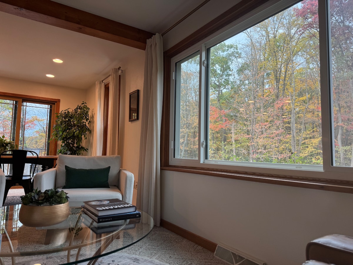 Fredelig beliggenhet for dette moderne tilfluktsstedet med to soverom, høyt tak og mye glass for å ta inn de naturlige omgivelsene. Fullt moderne kjøkken, koselig peis, to terrasser, klimaanlegg, murphy-seng for ekstra gjester, gassgrill og en bålplass. Stille vei – svært nær Devils Lake, Devils Head, Lake Wisconsin og Baraboo. Flott tilfluktssted for å lese og slappe av eller nyte stiene ved Devils Lake. Utmerkede restauranter ligger innen 5–15 minutter. En virkelig unik opplevelse med flott beliggenhet!